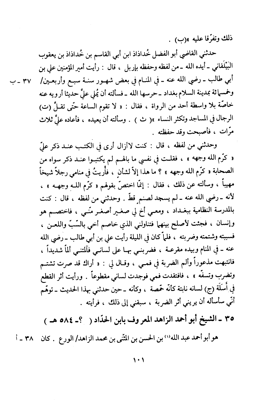 وَحَدَّثَنِي مِنْ لَفْظِهِ، قَالَ: كُنْتُ لَا أَزَالُ أَرَى فِي الْكُتُبِ عِنْدَ ذِكْرِ عَلِيٍّ «كَرَّمَ اللَّهُ وَجْهَهُ» ، فَقُلْتُ فِي نَفْسِي مَا بَالُهُمْ لَمْ يَكْتُبُوا عِنْدَ ذِكْرِ سِوَاهُ مِنَ الصَّحَابَةِ «كَرَّمَ الله وجهه» ؟ ما هذا إلّا لشأن، فأريت فِي مَنَامِي رَجُلًا شَيْخًا مَهِيبًا، وَسَأَلْتُهُ عَنْ ذَلِكَ، فَقَالَ: إِنَّمَا اخْتَصَّ بِقَوْلِهِمْ «كَرَّمَ اللَّهُ وَجْهَهُ» ، لِأَنَّهُ- رَضِيَ اللَّهُ عَنْهُ- لَمْ يَسْجُدْ لِصَنَمٍ قَطُّ. وَحَدَّثَنِي مِنْ لَفْظِهِ، قَالَ: كُنْتُ بِالْمَدْرَسَةِ النِّظَامِيَّةِ بِبَغْدَادَ، وَمَعِي أَخٌ لِي صَغِيرٌ أَصْغَرُ مِنِّي، فَاخْتَصَمَ هُوَ وَإِنْسَانٌ، فَجِئْتُ لِأُصْلِحَ بَيْنهُمَا فَتَنَاوَلَنِي الَّذِي خَاصَمَ أَخِي بِالسَّبِّ وَاللَّعْنِ، فَسَبَبْتُهُ وَشَتَمْتُهُ وَضَرَبْتُهُ، فَلَمَّا كَانَ فِي اللَّيْلَةِ رَأَيْتُ عَلِيَّ بْنَ أَبِي طَالِبٍ- رَضِيَ اللَّهُ عَنْهُ- فِي الْمَنَامِ وَبِيَدِهِ مِقْرَعَةٌ، فَضَرَبَنِي بِهَا عَلَى لِسَانِي فَآلَمَتْنِي أَلَمًا شَدِيدًا، فَانْتَبَهْتُ مَذْعُورًا وَأَلَمُ الضَّرْبَةِ فِي فَمِي، وَقَالَ لِي: «أَرَاكَ قَدْ صِرْتَ تَشْتُمُ وَتَضْرِبُ وَتُسَفِّهُ» ، فَافْتَقَدْتُ فَمِي فَوَجَدْتُ لِسَانِي مَقْطُوعًا. وَرَأَيْتُ أَثَرَ الْقَطْعِ فِي أسلة (ج) لِسَانِهِ نَابِتَةً كَأَنَّهُ حُمُّصَةٌ، وَكَأَنَّهُ- حِينَ حَدَّثَنِي بِهَذَا الْحَدِيثِ- تَوَهَّمَ أَنِّي سَأَسْأَلُهُ أَنْ يُرِيَنِي أَثَرَ الضَّرْبَةِ، سَبَقَنِي إِلَى ذَلِكَ، فَرَأَيْتُهُ.