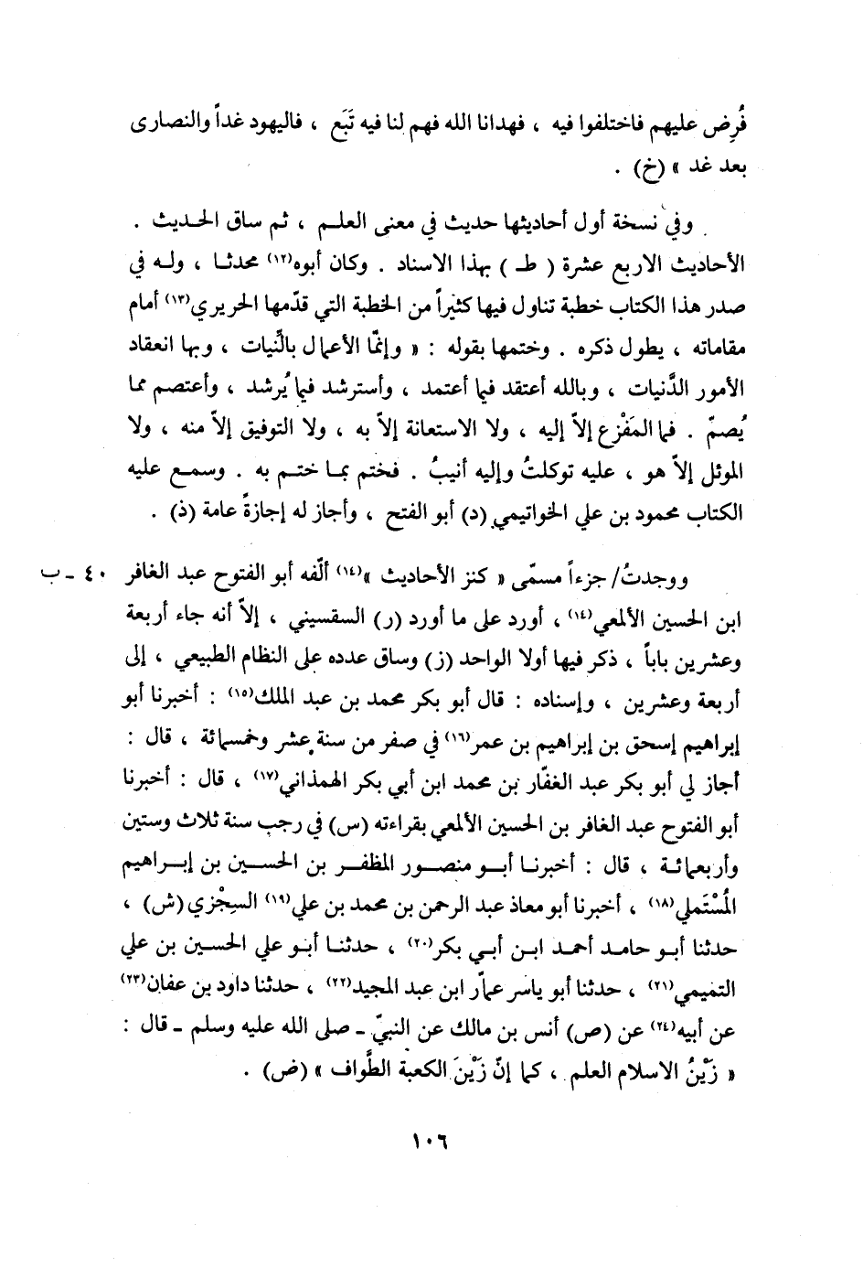 وَوَجَدْتُ/ جُزْءًا مُسَمًّى «كَنْزُ الْأَحَادِيثِ» (14) أَلَفَّهُ أَبُو الفتوح عبد الغافر ابن الحسين الألمعي (14) ، أورد على ما أورد (ر) السُّقْسَيْنِيُّ، إِلَّا أَنَّهُ جَاءَ أَرْبَعَةً وَعِشْرِينَ بَابًا، ذكر فيها أولا الواحد (ز) وَسَاقَ عَدَدَهُ عَلَى النِّظَامِ الطَّبِيعِيِّ، إِلَى أَرْبَعَةٍ وَعِشْرِينَ، وَإِسْنَادُهُ: قَالَ أَبُو بَكْرٍ مُحَمَّدُ بْنُ عَبْدِ الْمَلِكِ (15) : أَخْبَرَنَا أَبُو إِبْرَاهِيمَ إِسْحَاقُ بْنُ إِبْرَاهِيمَ بْنِ عُمَرَ (16) فِي صَفَرٍ مِنْ سَنَةَ عَشْرٍ وَخَمْسِمِائَةٍ، قَالَ: