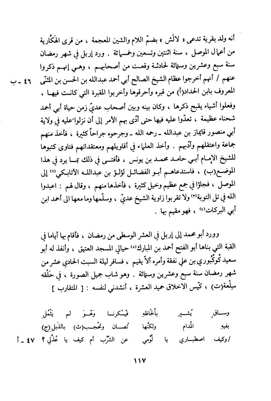 أَنَّهُ وُلِدَ بِقَرْيَةٍ تُدْعَى «لَالُشَ» بِضَمِّ اللَّامِ وَالشِّينِ الْمُعْجَمَةِ، مِنْ قُرَى الْهَكَّارِيَّةِ مِنْ أَعْمَالِ الْمَوْصِلِ، سَنَةَ اثْنَتَيْنِ وَتِسْعِينَ وَخَمْسِمِائَةٍ. وَرَدَ إِرْبِلَ فِي شَهْرِ رَمَضَانَ سَنَةَ سَبْعٍ وَعِشْرِينَ وَسِتِّمِائَةٍ الحادثة وَقَعَتْ مِنْ أَصْحَابِهِمْ، وَهِيَ أَنَّهُمْ ذَكَرُوا عَنْهُمْ/ أَنَّهُمْ أَخْرَجُوا عِظَامَ الشَّيْخِ الصَّالِحِ أَبِي أَحْمَدَ عَبْدِ اللَّهِ بْنِ الْحَسَنِ بْنِ الْمُثَنَّى الْمَعْرُوفِ بابن الحداد (أ) من قبره وَأَحْرَقُوهَا وَأَخْرَبُوا الْمَقْبَرَةَ الَّتِي كَانَت فِيهَا، وَفَعَلُوا أَشْيَاءَ يَقْبُحُ ذِكْرُهَا، وَكَانَ بَيْنَهُ وَبَيْنَ أَصْحَابِ عَدِيٍّ زَمَنَ حَيَاةِ أَبِي أَحْمَدَ شَحْنَاءُ عَظيَمَةٌ، تَعَدَّوْا عَلَيْهِ فِيهَا حَتَّى أَدَّى بِهِمُ الْأَمْرُ إِلَى أَنْ نَزَلُوا عَلَيْهِ فِي وَلَايَةِ أَبِي مَنْصُورٍ قَايِمَازَ بْنِ عَبْدِ اللَّهِ- رَحِمَهُ اللَّهُ- وَجَرَحُوهُ جِرَاحًا كَثِيرَةً، فَأَخَذَ مِنْهُمْ جَمَاعَةً وَاعْتَقَلَهَمْ وَأَدَّبَهُمْ. وَأَخَذَ الْعُلَمَاءُ فِي أَقَاوِيلِهِمْ وَمُعْتَقَدَاتِهِمْ فَتَاوَى كَتَبُوهَا لِلشَّيْخِ الْإِمَامِ أَبِي حَامِدٍ مُحَمَّدِ بْنِ يُونُسَ، فَأَفْتَى فِي ذَلِكَ بِمَا يَرِدُ فِي هذا الموضع (ب) ، فَاسْتَدْعَاهُمْ أَبُو الْفَضَائِلِ لُؤْلُؤُ بْنُ عَبْدِ اللَّهِ الأتابكي (2) إلى الموصل، فجاؤا فِي جَمْعٍ عَظِيمٍ وَخَيْلٍ كَثِيرَةٍ، فأَخَذَهَا مِنْهُمْ، وَقَالَ لَهُمُ: اعْبُدُوا اللَّهَ فِي تَلِّ التَّوْبَةِ (3) وَلَا تَقْرَبُوا زَاوِيَةَ الشَّيْخِ عَدِيٍّ، وَسَلَّمَهَا وَمَا معها الى أحمد ابن أَبِي الْبَرَكَاتِ (4) ، فَهُوَ مُقِيمٌ بِهَا.
