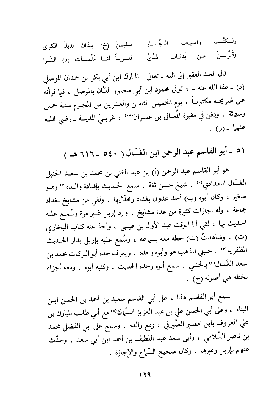 هُوَ أَبُو الْقَاسِمِ عَبْدُ الرَّحْمَنِ (أ) بْنُ عَبْدِ الغنيِّ بْنِ مُحَمَّدِ بْنِ سَعْدٍ الْحَنْبَلِيُّ الْغَسَّالُ البغدادي (1) . شَيْخٌ حَسَنٌ ثِقَةٌ، سَمِعَ الْحَدِيثَ بِإِفَادَة وَالِدِهِ (2) وَهُوَ صَغِيرٌ، وَكَانَ أَبُوهُ (ب) أَحَدُ عُدُولِ بَغْدَادَ وَمُحَدِّثِيهَا. وَلَقِيَ مِنْ مَشَايِخِ بَغْدَادَ جَمَاعَةً، وَلَهُ إِجَازَاتٌ كَثِيرَةٌ مِنْ عِدَّةِ مَشَايِخَ. وَرَدَ إِرْبِلَ غَيْرَ مَرَّةٍ وَسُمِعَ عَلَيْهِ الْحَدِيثُ بِهَا، لَقِيَ أَبَا الْوَقْتِ عَبْدَ الْأَوَّلِ بن عيسى، وأخذ عنه كتاب البخاري (ت) ، وشاهدت (ث) خَطَّهُ مَعَهُ بِسَمَاعِهِ، وَسُمِعَ عَلَيْهِ بِإِرْبِلَ بِدَارِ الْحَدِيثِ الْمُظَفَّرِيَّةِ (3) . حَنْبَلِيُّ الْمَذْهَبِ هُوَ وَأَبُوهُ وَجَدُّهُ، وَيُعْرَفُ جَدُّهُ أَبُو الْبَرَكَاتِ مُحَمَّدُ بْنُ سَعْدٍ الغسال (4) بالحنبلي. سمع أبوه وجده الحديث، وكتبه أبوه، ومعه أجزاء بخطه هي أصوله (ج) .