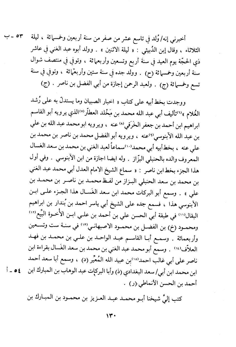 وَوَجَدْتُ بِخَطِّ أَبِيهِ عَلَى كِتَابِ «أَخْبَارِ الصَّبْيَانِ وَمَا يُسْتَدَلُّ بِهِ عَلَى رُشْدِ الْغُلَامِ» (6) تَأْلِيفُ أَبِي عَبْدِ اللَّهِ مُحَمَّدِ بْنِ مَخْلَدٍ الْعَطَّارِ (7) الذي يرويه أبو القاسم ابراهيم ابن أَحْمَدَ بْنِ جَعْفَرٍ الْخِرَقِيُّ (8) عَنْهُ، وَيَرْوِيهِ أَبُو مُحَمَّدٍ عَبْدُ اللَّهِ بْنُ عَلِيِّ بْنِ عَبْدِ اللَّهِ الْآبَنُوسِيُّ (9) عَنْهُ، وَيَرْوِيهِ أَبُو الْفَضْلِ مُحَمَّدُ بْنُ نَاصِرِ بْنِ مُحَمَّدِ بْنِ عَلِيٍّ عَنْهُ، بِخَطِّ أَبِيهِ أَبِي مُحَمَّدٍ (10) سَمَاعًا لِعَبْدِ الْغَنِيِّ بْنِ مُحَمَّدِ بْنِ سَعْدٍ الْغَسَّالِ الْمَعْرُوفِ وَالِدُهُ بِالْحَنْبَلِيِّ الْبَزَّازِ. وَلَهُ أَيْضًا إِجَازَةٌ مِنِ ابْنِ الْآبَنُوسِيِّ. وَفِي أَوَّلِ هَذَا الْجُزْءِ بِخَطِّ ابْنِ نَاصِرٍ: «سَمَاعُ الشَّيْخِ الْإِمَامِ الْعَدْلِ أَبِي مُحَمَّدٍ عبد الغني بن محمد بن سعد الحنبلي الْبَزَّازِ مِنْ لَفْظِ مُحَمَّدِ بْنِ نَاصِرَ بْنِ مُحَمَّدِ بْنِ عَلِيٍّ» . وَسَمِعَ أَبُو الْبَرَكَاتِ مُحَمَّدُ ابن سَعْدٍ الْغَسَّالُ هَذَا الْجُزْءَ عَلَى ابْنِ الْآبَنُوسِيِّ هَذَا، فَسَمِعَ جَدُّهُ عَلَى الشَّيْخِ أَبِي يَاسِرٍ أَحْمَدَ بْنِ بُنْدَارِ بْنِ إِبْرَاهِيمَ الْبَقَّالِ (11) فِي طَبَقَةِ أَبِي الْحَسَنِ عَلِيِّ بْنِ أَحْمَدَ بْنِ علي ابن الأخوة البيّع (12) ومحمود (خ) بْنِ الْفَضْلِ بْنِ مَحْمُودٍ الْأَصْبَهَانِيِّ (13) فِي سَنَةِ سِتٍّ وَتِسْعِينَ وَأَرْبَعِمِائَةٍ. وَسَمِعَ أَبَا الْقَاسِمِ عَبْدَ الْوَاحِدِ بْنِ عَلِيِّ بْنِ مُحَمَّدِ بْنِ فَهْدٍ الْعَلَّافَ (14) . وَسَمِعَ أَبُو مُحَمَّدٍ عَبْدَ الْغَنِيِّ بْنَ مُحَمَّدِ بْنِ سَعْدٍ الْغَسَّالَ بِقِرَاءَةِ ابْنِ نَاصِرٍ عَلَى أَبِي غَالِبٍ أَحْمَدَ (15) بْنِ عُبَيْدِ اللَّهِ المعيّر (د) ، وسمع أبا سعد أحمد ابن محمد ابن أبي/ سعد البغدادي (ذ) وأبا البركات عبد الوهاب بن المبارك ابن أحمد بن الحسن الأنماطي (ر) .