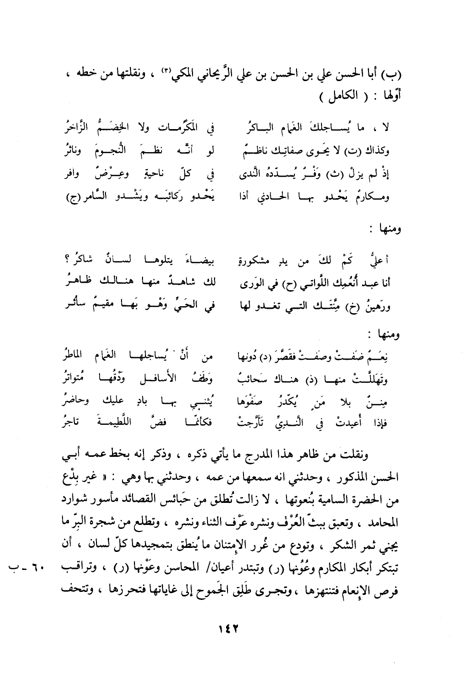 (ب) أَبَا الْحَسَنِ عَلِيَّ بْنَ الْحَسَنِ بْنَ عَلِيٍّ الرّيحاني المكي (3) ، ونقلتها من خطه، أوّلها: (الكامل)