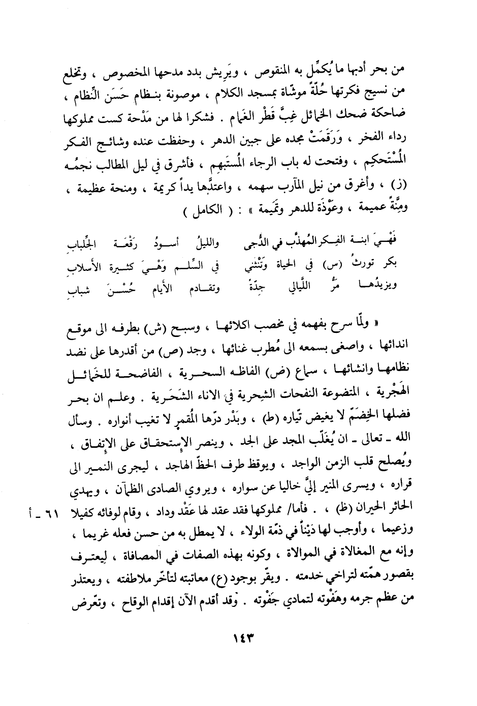 مِنْ بَحْرِ أَدَبِهَا مَا يُكَمِّلُ بِهِ الْمَنْقُوصَ، وَيَرِيشُ بَدَدَ مَدْحِهَا الْمَخْصُوصِ، وَتَخْلَعَ مِنْ نَسِيجِ فِكْرَتِهَا حُلَّةً مُوَشَّاةً بِمَسْجِدِ الْكَلَامِ، مَوْصُونَةً بِنِظَامٍ حَسَنِ النِّظَامِ، ضَاحِكَةً ضِحْكَ الْخَمَائِلِ غِبَّ قَطْرِ الْغَمَامِ. فَشُكْرًا لَهَا مِنْ مِدْحَةٍ كَسَتْ مَمْلُوكَهَا رِدَاءَ الْفَخْرِ، وَرَقَمَتْ مَجْدَهُ عَلَى جَبِينِ الدَّهْرِ، وَحَفِظَتْ عِنْدَهُ وَشَائِجَ الْفِكْرِ الْمُسْتَحَكِمِ، وَفتَحَتْ لَهُ بَابَ الرَّجَاءِ الْمُسْتَبْهِمِ، فَأَشْرَقَ فِي لَيْلِ الْمَطَالِبِ نجمه (ز) ، وَأَغْرَقَ مِنْ نَيْلِ الْمَآرِبِ سَهْمُهُ، وَاعْتَدَّهَا يَدًا كَرِيمَةً، وَمِنْحَةً عَظِيمَةً، وَمِنَّةً عَمِيمَةً، وَعَوْذَةً لِلدَّهْرِ وتميمة» : (الكامل)