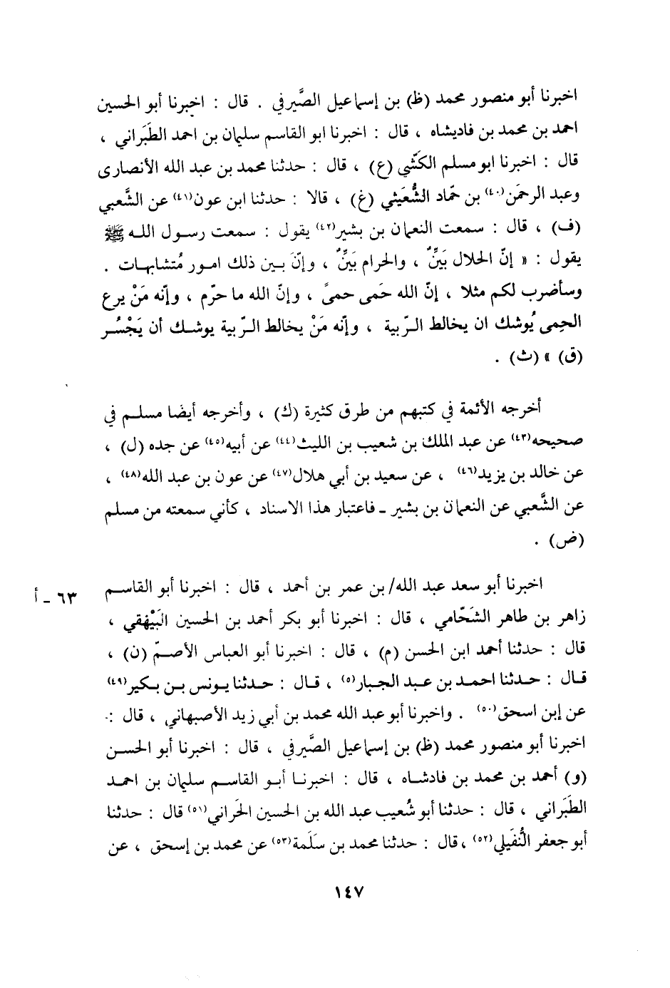 اخبرنا أبو منصور محمد (ظ) بْنُ إِسْمَاعِيلَ الصَّيْرَفِيُّ. قَالَ: أَخْبَرَنَا أَبُو الْحُسَيْنِ أَحْمَدُ بْنُ مُحَمَّدِ بْنِ فَادِيشَاه، قَالَ: أَخْبَرَنَا أَبُو الْقَاسِمِ سُلَيْمَانُ بْنُ أَحْمَدَ الطَّبَرَانِيُّ، قَالَ: اخبرنا ابو مسلم الكشّي (ع) ، قَالَ: حَدَّثَنَا مُحَمَّدُ بْنُ عَبْدِ اللَّهِ الْأَنْصَارِيُّ وعبد الرحمن (40) بن حمّاد الشّعيثي (غ) ، قالا: حدثنا ابن عون (41) عن الشّعبي (ف) ، قَالَ: سَمِعْتُ النُّعْمَانَ بْنَ بَشِيرٍ (42) يَقُولُ: سَمِعْتُ رَسُولَ اللَّهِ صَلَّى اللَّهُ عَلَيْهِ وَسَلَّمَ يَقُولُ: «إِنَّ الْحَلَالَ بَيِّنٌ، وَالْحَرَامَ بَيِّنٌ، وَإِنَّ بَيْنَ ذَلِكَ أُمُورٌ مُتَشَابِهَاتٌ.