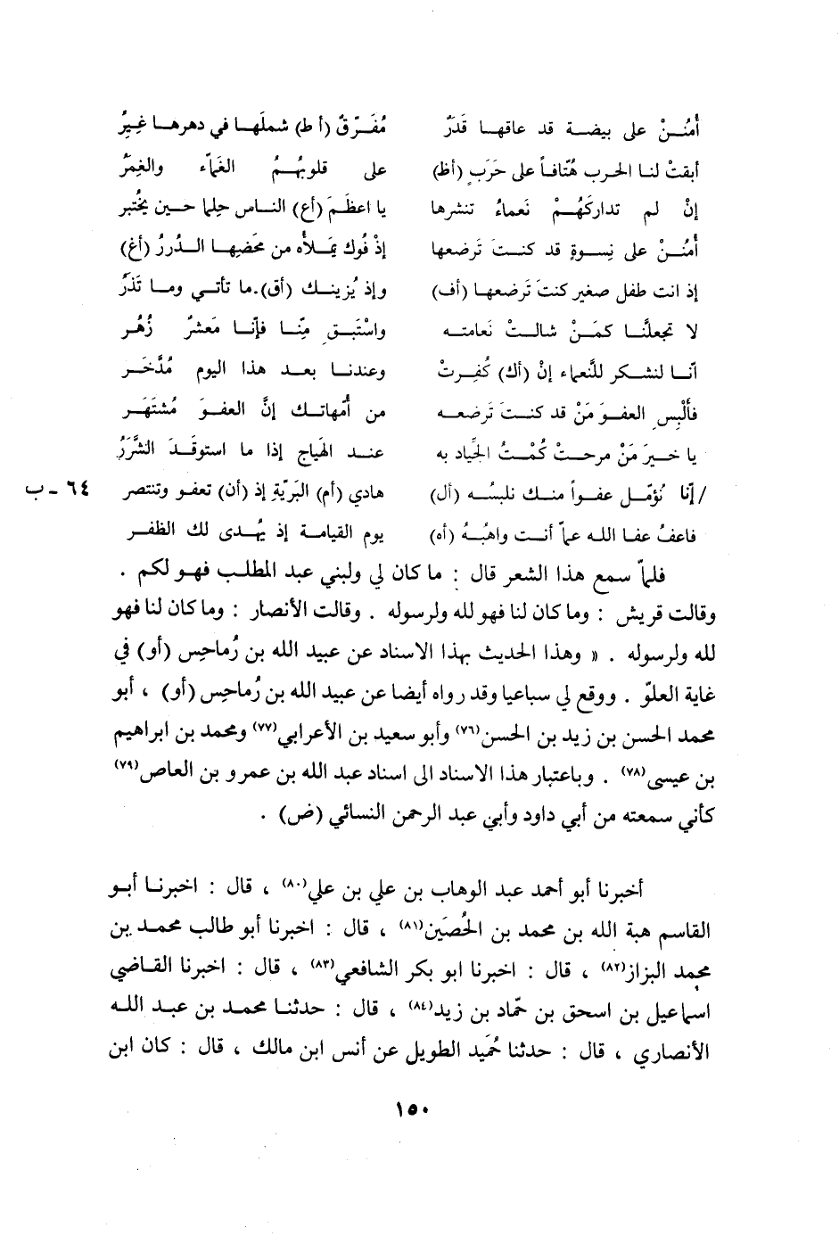 وَقَالَتْ قُرَيْشٌ: وَمَا كَانَ لَنَا فَهُوَ لِلَّهِ وَلِرَسُولِهِ. وَقَالَتِ الْأَنْصَارُ: وَمَا كَانَ لَنَا فَهُوَ لِلَّهِ وَلِرَسُولِهِ. «وَهَذَا الْحَدِيثُ بِهَذَا الْإِسْنَادِ عَنْ عُبَيْدِ اللَّهِ بن رماحس (أو) فِي غَايَةِ الْعُلُوِّ. وَوَقَعَ لِي سُبَاعِيًّا وَقَدْ رَوَاهُ أَيْضًا عَنْ عُبَيْدِ اللَّهِ بْنِ رُمَاحِسٍ (أو) ، أَبُو مُحَمَّدٍ الْحَسَنُ بْنُ زَيْدِ بْنِ الْحَسَنِ (76) وَأَبُو سَعِيدِ بْنِ الْأَعْرَابِيِّ (77) وَمُحَمَّدُ بْنُ إِبْرَاهِيمَ بْنِ عِيسَى (78) . وَبِاعْتِبَارِ هَذَا الْإِسْنَادِ إِلَى إِسْنَادِ عَبْدِ اللَّهِ بْنِ عَمْرِو بْنِ الْعَاصِ (79) كَأَنِّي سَمِعْتُهُ مِنْ أَبِي دَاوُدَ وَأَبِي عَبْدِ الرَّحْمَنِ النسائي (ض) .