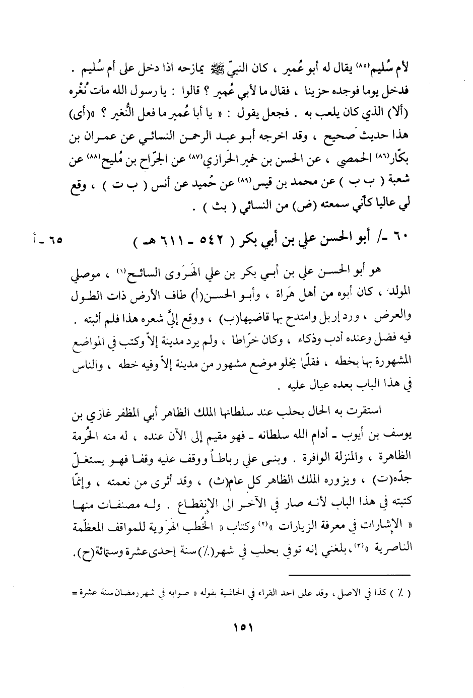 اسْتَقَرَّتْ بِهِ الْحَالُ بِحَلَبَ عِنْدَ سُلْطَانِهَا الْمَلِكِ الظَّاهِرِ أَبِي الْمُظَفَّرِ غَازِي بْنِ يُوسُفَ بْنِ أَيُّوبَ- أَدَامَ اللَّهُ سُلْطَانَهُ- فَهُوَ مُقِيمٌ إِلَى الْآنَ عِنْدَهُ، لَهُ مِنْهُ الْحُرْمَةُ الظَّاهِرَةُ، وَالْمَنْزِلَةُ الْوَافِرَةُ. وَبَنَى عَلِيٌّ رِبَاطًا وَوَقَّفَ عَلَيْهِ وَقْفًا فَهُوَ يَسْتَغِلُّ جَدَّهُ (ت) ، ويزوره الملك الظاهر كل عام (ث) ، وَقَدْ أَثْرَى مِنْ نِعْمَتِهِ، وَإِنَّمَا كَتَبْتُهُ فِي هَذَا الْبَابِ لِأَنَّهُ صَارَ فِي الْآخِرِ إِلَى الِانْقِطَاعِ. وَلَهُ مُصَنَّفَاتٌ مِنْهَا «الْإِشَارَاتُ فِي مَعْرِفَةِ الزِّيَارَاتِ» (2) وَكِتَابُ «الْخُطَبُ الْهَرَوِيَّةُ لِلْمَوَاقِفِ الْمُعَظَّمَةِ النَّاصِرِيَّةِ» (3) ، بَلَغَنِي أَنَّهُ تُوُفِّيَ بِحَلَبَ فِي شَهْرِ «2» سَنَةَ إحدى عشرة وستمائة (ح) .