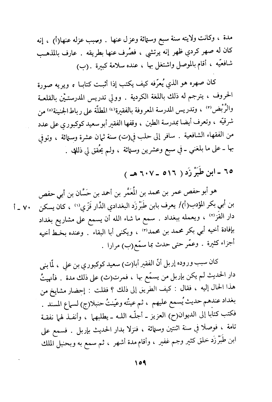 مُدَّةً، وَكَانَتْ وَلَايَتُهُ سَنَةَ سَبْعٍ وَسِتِّمِائَةٍ وَعُزِلَ عنها. وسبب عزله عنها (أ) ، أَنَّهُ كَانَ لَهُ صِهْرٌ كُرْدِيٌّ ظَهَرَ أَنَّهُ يَرْتَشِي، فَصُرِفَ عَنْهَا بِطَرِيقِهِ. عَارِفٌ بِالْمَذْهَبِ شَافِعِيِّهِ، أَقَامَ بِالْمَوْصِلِ وَاشْتَغَلَ بِهَا، عِنْدَهُ سَلَامَةٌ كَبِيرَةٌ. (ب)