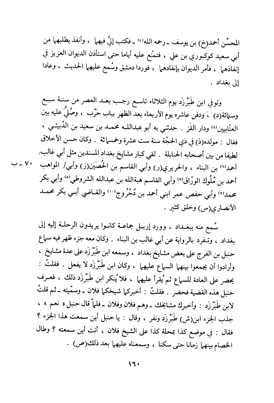 المحسّن أحمد (خ) بْنُ يُوسُفَ- رَحِمَهُ اللَّهُ (4) - فَكَتَبَ إِلَيَّ فِيهِمَا، وأنفذ يطلبهما من أبي سعيد كُوكُبُورِيِّ بْنِ عَلِيٍّ، فَتَمَنَّعَ عَلَيْهِ أَيَّامًا حَتَّى اسْتَأْذَنَ الدِّيوَانَ الْعَزِيزَ فِي إِنْفَاذِهِمَا، فَأَمَرَ الدِّيوَانُ بإنفادهما، فَوَرَدَا دِمَشْقَ وَسُمِعَ عَلَيْهِمَا الْحَدِيثُ، وَعَادَا إِلَى بَغْدَادَ.