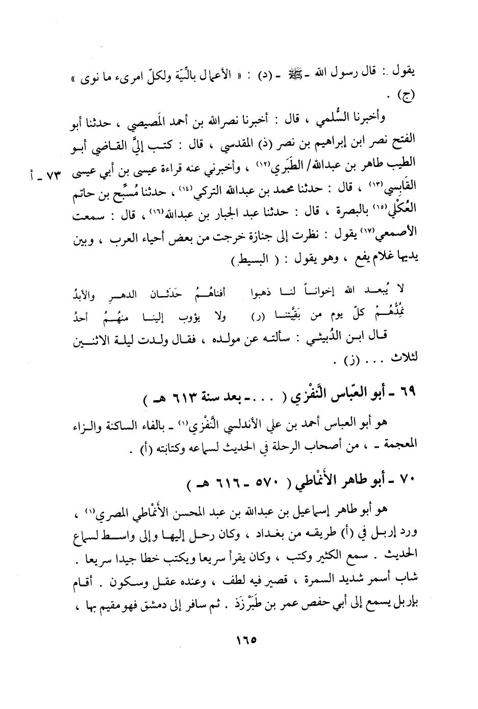وَأَخْبَرَنَا السُّلَمِيُّ، قَالَ: أَخْبَرَنَا نَصْرُ اللَّهِ بْنُ أحمد المصيصي، حدثنا أبو الفتح نصر ابن ابراهيم بن نصر (ذ) الْمَقْدِسِيُّ، قَالَ: كَتَبَ إِلَيَّ الْقَاضِي أَبُو الطَّيِّبِ طَّاهِرُ بْنُ عَبْدِ اللَّهِ/ الطَّبَرِيُّ (12) ، وَأَخْبَرَنِي عَنْهُ قِرَاءَةً عِيسَى بْنَ أَبِي عِيسَى الْقَابِسِيُّ (13) ، قَالَ: حَدَّثَنَا مُحَمَّدُ بْنُ عَبْدِ اللَّهِ التُّرْكِيُّ (14) ، حَدَّثَنَا مُسَبِّحُ بْنُ حَاتِمٍ الْعُكْلِيُّ (15) بِالْبَصْرَةِ، قَالَ: حَدَّثَنَا عَبْدُ الْجَبَّارِ بْنُ عَبْدِ اللَّهِ (16) ، قَالَ: سَمِعْتُ الْأَصْمَعِيَّ (17) يَقُولُ: نَظَرْتُ إِلَى جَنَازَةٍ خَرَجَتْ مِنْ بَعْضِ أَحْيَاءِ الْعَرَبِ، وَبَيْنَ يَدَيْهَا غُلَامٌ يَفَعٌ، وهو يقول: (البسيط)