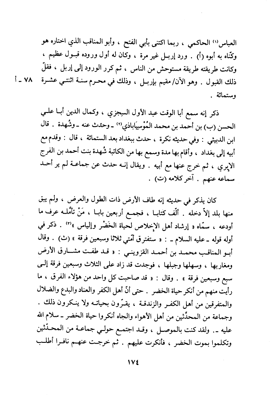 وَجَمَاعَةٌ مِنَ الْمُحَدِّثِينَ مِنْ أَهْلِ الْأَهْوَاءِ وَالْجَاهِ أَنْكَرُوا حَيَاةَ الْخَضْرِ- سَلَامُ اللَّهِ عَلَيْهِ-. وَلَقَدْ كُنْتُ بِالْمَوْصِلِ، وَقَدِ اجْتَمَعَ حَوْلي جَمَاعَةٌ مِنَ الْمُحَدِّثِينَ وَتَكَلَّمُوا بِمَوْتِ الْخَضْرِ، فَأْنَكَرْتُ عَلَيْهِمْ. ثُمَّ خَرَجْتُ عَنْهُمْ نَافِرًا أَطْلُبُ