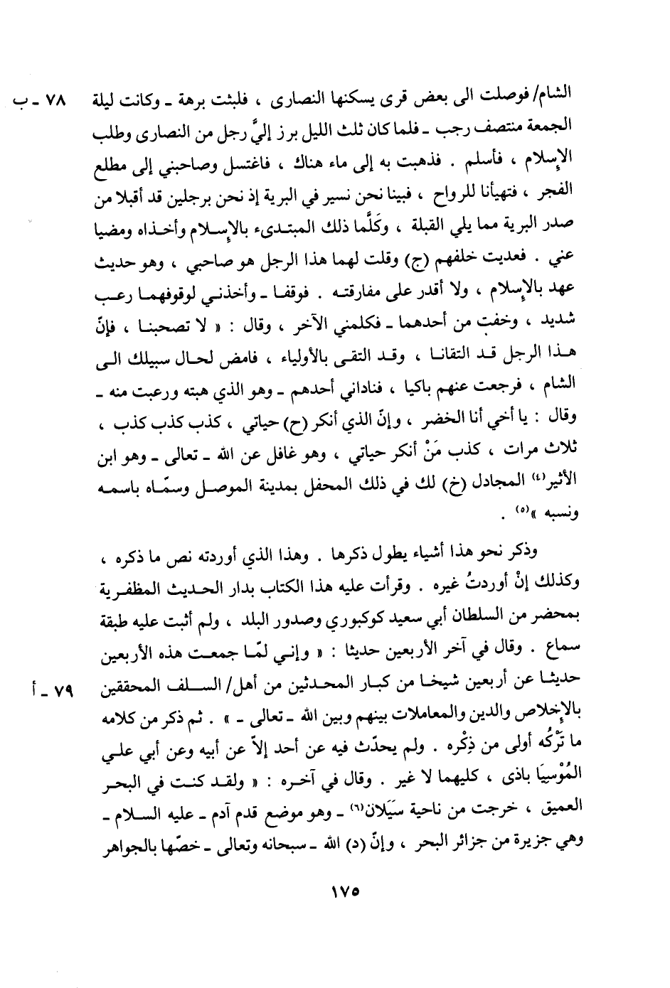 الشَّامَ/ فَوَصَلْتُ إِلَى بَعْضِ قُرًى يَسْكُنُهَا النَّصَارَى، فَلَبِثْتُ بُرْهَةً- وَكَانَتْ لَيْلَةَ الْجُمُعَةِ مُنْتَصَفَ رَجَبٍ- فَلَمَّا كَانَ ثُلُثُ اللَّيْلِ بَرَزَ إِلَيَّ رَجُلٌ مِنَ النَّصَارَى وَطَلَبَ الْإِسْلَام، فَأَسْلَمَ. فَذَهَبْتُ بِهِ إِلَى مَاءٍ هُنَاكَ، فَاغْتَسَلَ وَصَاحَبَنِي إِلَى مَطْلَعِ الْفَجْرِ، فَتَهَيِّأْنَا لِلرَّوَاحِ، فَبَيْنَا نَحْنُ نَسِيرُ فِي الْبَرِيَّةِ إِذْ نَحْنُ بِرَجُلَيْنِ قَدْ أَقْبَلَا مِنْ صَدْرِ الْبَرِيَّةِ مِمَّا يَلِي الْقِبْلَةَ، وَكَلَّمَا ذَلِكَ المبتدىء بالإسلام وأخذاه ومضيا عني. فعديت خلفهم (ج) وَقُلْتُ لَهُمَا هَذَا الرَّجُلُ هُوَ صَاحِبِي، وَهُوَ حَدِيثُ عَهْدٍ بِالْإِسْلَامِ، وَلَا أَقْدِرُ عَلَى مُفَارَقَتِهِ. فَوَقَفَا- وَأَخَذَنِي لِوُقُوفِهِمَا رُعْبٌ شَدِيدٌ، وَخِفْتُ مِنْ أَحَدِهَمَا- فَكَلْمَنِي الْآخَرُ، وَقَالَ: «لَا تَصْحَبْنَا، فَإِنَّ هَذَا الرَّجُلَ قَدِ الْتَقَانَا، وَقَدِ الْتَقَى بِالْأَوْلِيَاءِ، فَامْضِ لِحَالِ سَبِيلِكَ إِلَى الشَّامِ، فَرَجَعْتُ عَنْهُمْ بَاكِيًا، فَنَادَانِي أَحَدَهُمْ- وَهُوَ الَّذِي هِبْتُهُ وَرُعِبْتُ مِنْهُ- وَقَالَ: يَا أَخِي أَنَا الْخَضْرُ، وَإِنَّ الذي أنكر (ح) حَيَاتِي، كَذَبَ كَذَبَ كَذَبَ، ثَلَاثَ مَرَّاتٍ، كَذَبَ مَنْ أَنْكَرَ حَيَاتِي، وَهُوَ غَافِلٌ عَنِ اللَّهِ- تعالى- وهو ابن الأثير (4) المجادل (خ) لَكَ فِي ذَلِكَ الْمَحْفِلِ بِمَدِينَةِ الْمَوْصِلِ وَسَمَّاهُ بِاسْمِهِ وَنَسَبِهِ» (5) .