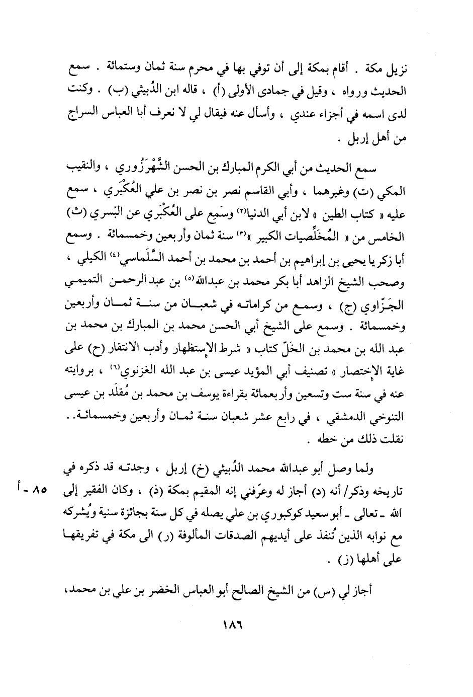 وَلَمَّا وَصَلَ أبو عبد الله محمد الدبيثي (خ) إِرْبِلَ، وَجَدْتُهُ قَدْ ذَكَرَهْ فِي تَارِيخِهِ وَذَكَرَ/ أنه (د) أجاز له وعرّفني إنه المقيم بمكة (ذ) ، وَكَانَ الْفَقِيرُ إِلَى اللَّهِ- تَعَالَى- أَبُو سَعِيدٍ كُوكُبُورِيُّ بْنُ عَلِيٍّ يَصِلُهُ فِي كُلِّ سَنَةٍ بِجَائِزَةٍ سَنِيَّةٍ وَيُشْرِكُهُ مَعَ نُوَّابِهِ الَّذِينَ تُنْفَذُ على أيديهم الصدقات المألوفة (ر) الى مكة في تفريقها على أهلها (ز) .