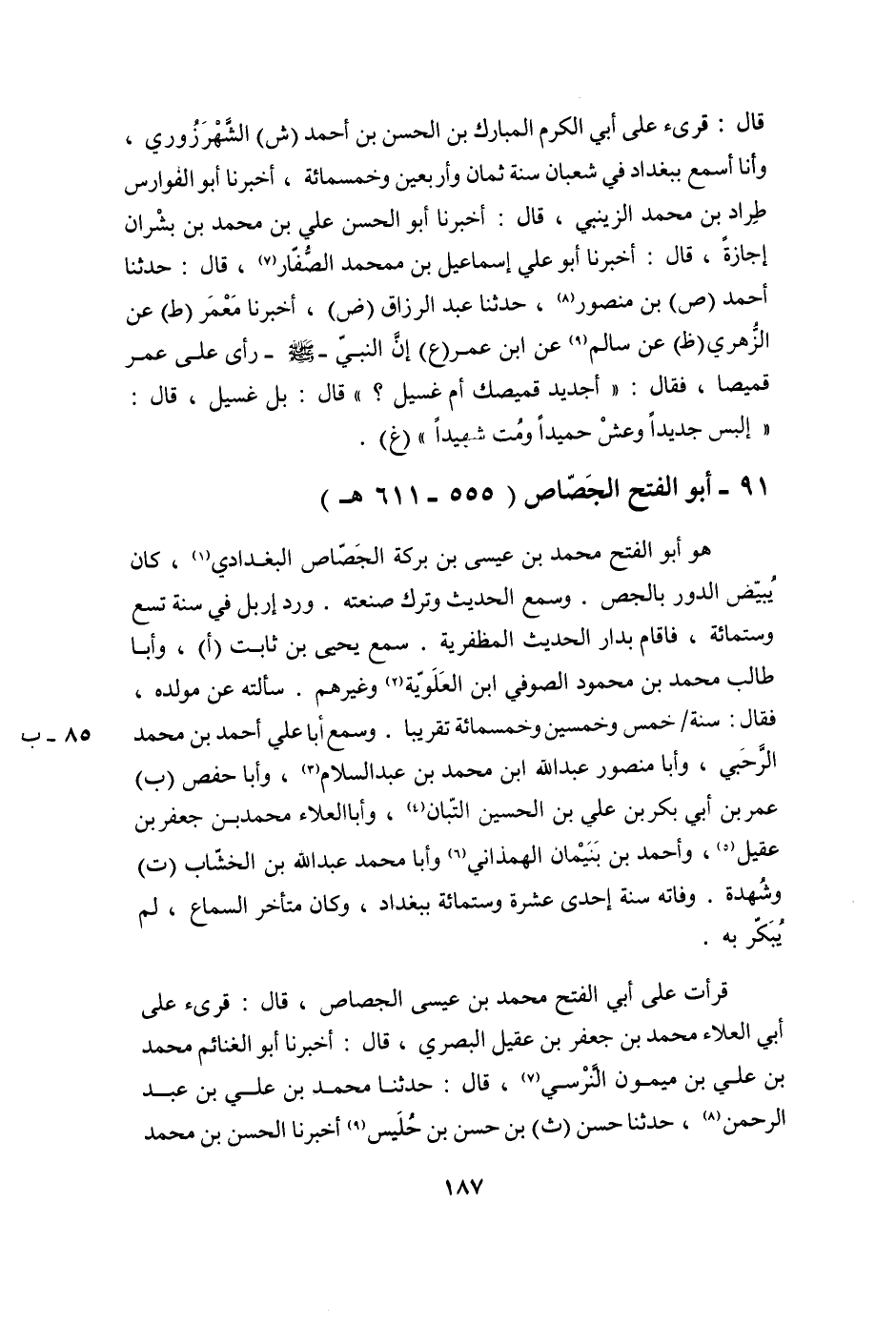 قال: قرىء عَلَى أَبِي الْكَرَمِ الْمُبَارَكِ بْنِ الْحَسَنِ بْنِ أحمد (ش) الشَّهْرَزُورِيِّ، وَأَنَا أَسْمَعُ بِبَغْدَادَ فِي شَعْبَانَ سَنَةَ ثَمَانٍ وَأَرْبَعِينَ وَخَمْسِمِائَةٍ، أَخْبَرَنَا أَبُو الْفَوَارِسِ طِرَادُ بْنُ مُحَمَّدٍ الزَّيْنَبِيُّ، قَالَ: أَخْبَرَنَا أَبُو الْحَسَنِ عَلِيُّ بْنُ مُحَمَّدِ بْنِ بِشْرَانَ إِجَازَةً، قَالَ: أَخْبَرَنَا أَبُو عَلِيٍّ إِسْمَاعِيلُ بْنُ مُحَمَّدِ الصُّفَّارُ (7) ، قال: حدثنا أحمد (ص) بن منصور (8) ، حدثنا عبد الرزاق (ض) ، أخبرنا معمر (ط) عن الزّهري (ظ) عن سالم (9) عن ابن عمر (ع) أَنَّ النَّبِيَّ- صَلَّى اللَّهُ عَلَيْهِ وَسَلَّمَ- رَأَى عَلَى عُمَرَ قَمِيصًا، فَقَالَ: «أَجَدِيدٌ قَمِيصُكَ أَمْ غَسِيلٌ؟» قَالَ: بَلْ غَسِيلٌ، قَالَ: