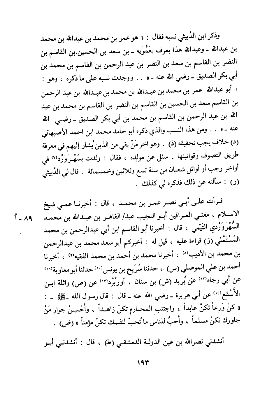 «أَبُو عَبْدِ اللَّهِ عُمَرُ بْنُ مُحَمَّدِ بْنِ عَبْدِ اللَّهِ بْنِ مُحَمَّدِ بْنِ عَبْدِ اللَّهِ بْنِ عَبْدِ الرَّحْمَنِ بْنِ الْقَاسِمِ سَعْدِ بْنِ الْحُسَيْنِ بْنِ الْقَاسِمِ بْنِ النَّضْرِ بْنِ الْقَاسِمِ بْنِ مُحَمَّدِ بْنِ عَبْدِ اللَّهِ بْنِ عَبْدِ الرَّحْمَنِ بْنِ الْقَاسِمِ بْنِ مُحَمَّدِ بْنِ أَبِي بَكْرٍ الصِّدِّيقِ- رَضِيَ اللَّهُ عَنْهُ- «.. وَمِنْ هَذَا النسب والذي ذكره أبو حامد محمد ابن احمد الأصبهاني (د) خلاف يجب تحقيقه (ذ) . وَهُوَ آخِرُ مَنْ بَقِيَ مِنَ الَّذِينَ يُشَارُ إِلَيْهِمْ فِي مَعْرِفَةِ طَرِيقِ التَّصَوُّفِ وَقَوَانِينِهَا. سُئِلَ عَنْ مَوْلِدِهِ، فَقَالَ: وُلِدْتُ بِسُهْرَوَرْدَ (7) فِي أَوَاخِرِ رَجَبٍ أَوْ أَوَائِلِ شَعْبَانَ مِنْ سَنَةِ تِسْعٍ وثلاثين وخمسمائة. قال لي الدبيثي (ر) : سَأَلْتُهُ عَنْ ذَلِكَ فَذَكَرَهُ لِي كَذِلِكَ.
