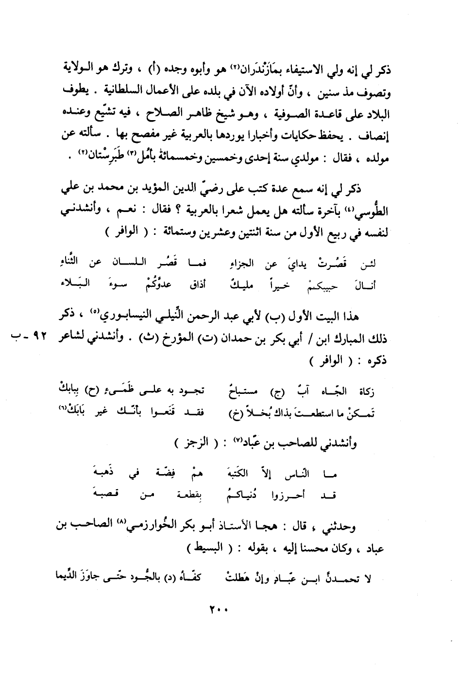 ذَكَرَ لِي أَنَّهُ وَلِيَ الِاسْتِيفَاءَ بِمَازَنْدَرَانَ (2) هُوَ وأبوه وجده (أ) ، وَتَرَكَ هُوَ الْوَلَايَةَ وَتَصَوَّفَ مُذْ سِنِينَ، وَأَنَّ أَوْلَادَهُ الْآنَ فِي بَلَدِهِ عَلَى الْأَعْمَالِ السُّلْطَانِيَّةِ. يَطُوفُ الْبِلَادَ عَلَى قَاعِدَةِ الصُّوفِيَّةِ، وَهُوَ شَيْخٌ ظَاهِرٌ الصَّلَاحِ، فِيهِ تَشَيُّعٌ وَعِنْدَهُ إِنْصَافٌ. يَحْفَظُ حِكَايَاتٍ وَأَخْبَارًا يُورِدُهَا بِالْعَرَبِيَّةِ غَيْرَ مُفْصِحٍ بِهَا. سَأَلْتُهُ عَنْ مَوْلِدِهِ، فَقَالَ: مَوْلِدِي سَنَةَ إِحْدَى وَخَمْسِينَ وَخَمْسِمِائَةٍ بِأَمُلَ (3) طَبَرِسْتَانَ (2) .