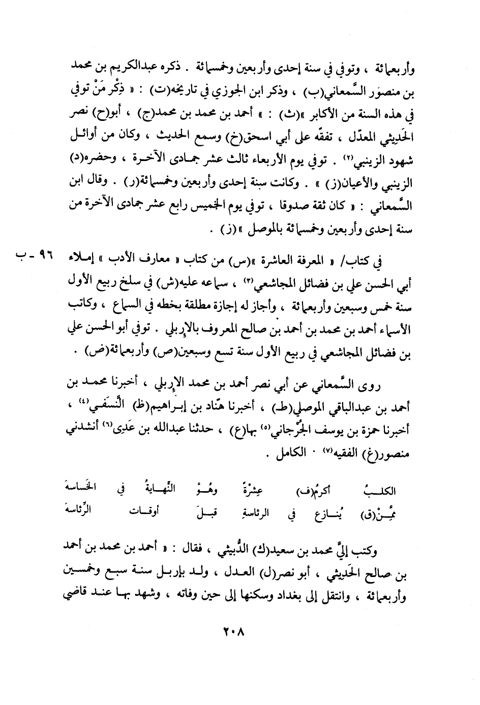 رَوَى السَّمْعَانِيُّ عَنْ أَبِي نَصْرٍ أَحْمَدَ بْنِ مُحَمَّدٍ الْإِرْبِلِيُّ، أَخْبَرَنَا مُحَمَّدُ بْنُ أَحْمَدَ بْنِ عبد الباقي الموصلي (ط) ، أخبرنا هنّاد بن إبراهيم (ظ) النَّسَفِيُّ (4) ، أَخْبَرَنَا حَمْزَةُ بْنُ يُوسُفَ الْجُرْجَانِيّ (5) بِهَا (ع) ، حَدَّثَنَا عَبْدُ اللَّهِ بْنُ عَدِيٍّ (6) أَنْشَدَنِي مَنْصُورٌ (غ) الفقيه (7) . الكامل.