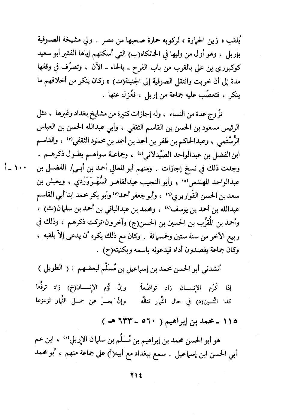 وَجَدْتُ ذَلِكَ فِي نُسَخِ إِجَازَاتٍ. وَمِنْهُمُ أَبُو الْمَعَالِي أَحْمَدُ بْنُ أَبِي/ الْفَضْلِ بْنِ عَبْدِ الْوَاحِدِ الْمُهَنْدِسُ (5) ، وَأَبُو النَّجِيبِ عَبْدُ الْقَاهِرِ السُّهْرَوَرْدِيُّ، وَيَعِيشُ بْنُ سَعْدِ بْنِ الْحَسَنِ الْقَوَارِيرِيُّ (6) ، وَأَبُو جَعْفَرِ أحمد (7) وأبو بكر محمد ابنا أبي القاسم عبد الله بن أحمد بن يوسف (8) ، ومحمد بْنُ عَبْدِ الْبَاقِي بْنِ أحمد بن سلمان (ث) ، وَأَحْمَدُ بْنُ الْمُقَرِّبِ بْنِ الْحُسَيْنِ بْنِ الْحَسَنِ (ج) وَآخَرُونَ تَرَكْتُ ذِكْرُهُمْ، وَذَلِكَ فِي رَبِيعٍ الْآخَرِ مِنْ سَنَةِ سِتِّينَ وَخَمْسِمِائَةٍ. وَكَانَ مَعَ ذَلِكَ يَكْرَهُ أَنْ يُدْعَى إِلَّا بِلَقَبِهِ، وَكَانَ جَمَاعَةٌ يقصدون أذاه فيدعونه باسمه وبكنيته (ح) .