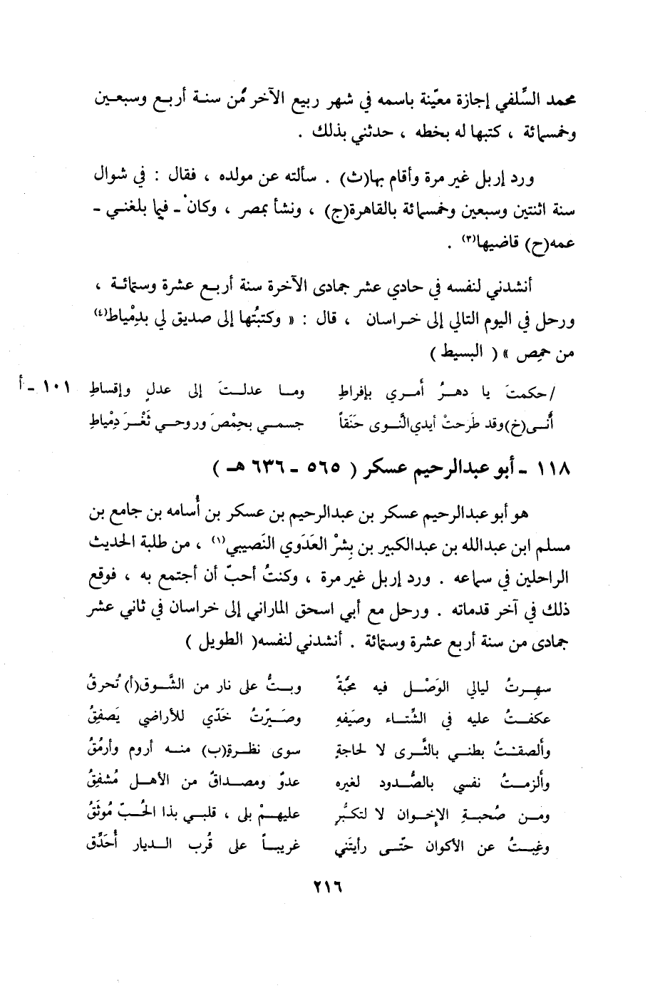 أَنْشَدَنِي لِنَفْسِهِ فِي حَادِيَ عَشَرَ جُمَادَى الْآخِرَةِ سَنَةَ أَرْبَعَ عَشْرَةَ وَسِتِّمِائَةٍ، وَرَحَلَ فِي الْيَوْمِ التَّالِي إِلَى خُرَاسَانَ، قَالَ: «وَكَتَبْتُهَا إِلَى صديق لي بدمياط (4) من حمص» (البسيط)