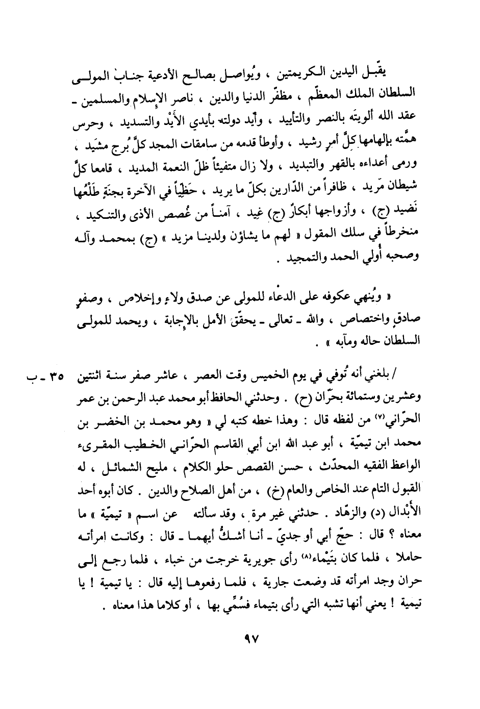 / بَلَغَنِي أَنَّهُ تُوُفِّيَ فِي يَوْمِ الْخَمِيسِ وَقْتَ العصر، عاشر صفر سنة اثنتين وعشرين وستمائة بحرّان (ح) . وَحَدَّثَنِي الْحَافِظُ أَبُو مُحَمَّدٍ عَبْدُ الرَّحْمَنِ بْنِ عُمَرَ الْحَرَّانِيُّ (7) مِنْ لَفْظِهِ قَالَ: وَهَذَا خَطُّهُ كَتَبَهُ لِي «وَهُوَ مُحَمَّدُ بْنُ الْخَضِرِ بْنِ محمد ابن تيميّة، أبو عبد الله ابن أَبِي الْقَاسِمِ الْحَرَّانِيُّ الْخَطِيبُ الْمُقْرِئُ الْوَاعِظُ الْفَقِيهُ الْمُحَدِّثُ، حَسَنُ الْقَصَصِ حُلْوُ الْكَلَامِ، مَلِيحُ الشَّمَائِلِ، له القبول التام عند الخاص والعام (خ) ، مِنْ أَهْلِ الصَّلَاحِ وَالدَّينِ. كَانَ أَبُوهُ أَحَدَ الأبدال (د) وَالزُّهَّادِ. حَدَّثَنِي غَيْرَ مَرَّةٍ، وَقَدْ سَأَلْتُهُ عَنِ اسْمِ «تَيْمِيَّةَ» مَا مَعْنَاهُ؟ قَالَ: حَجَّ أَبِي أَوْ جَدِّي- أَنَا أَشُكُّ أَيُّهُمَا- قَالَ: وَكَانَتِ امْرَأَتُهُ حَامِلًا، فَلَمَّا كَانَ بتَيْمَاءَ (8) رَأَى جُوَيْرِيَةً خَرَجَتْ مِنْ خِبَاءٍ، فَلَمَّا رَجَعَ إِلَى حَرَّانَ وَجَدَ امْرَأَتَهُ قَدْ وَضَعَتْ جَارِيَةً، فَلَمَّا رَفَعُوهَا إِلَيْهِ قَالَ: يَا تَيْمِيَّةَ! يَا تَيْمِيَّةَ! يَعْنِي أَنَّهَا تُشْبِهُ الَّتِي رَأَى بِتَيْمَاءَ فَسُمِّيَ بِهَا، أَوْ كَلَامًا هَذَا مَعْنَاهُ.