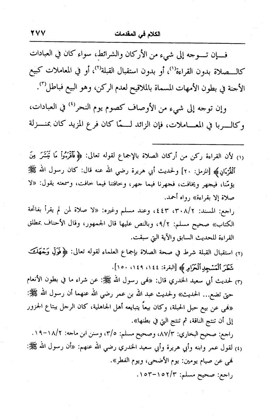 فإن توجه إلى شيء من الأركان والشرائط، سواء كان في العبادات كالصلاة بدون القراءة (١)، أو بدون استقبال القبلة (٢)، أو في المعاملات كبيع الأجنة في بطون الأمهات المسماة بالملاقيح لعدم الركن، وهو البيع فباطل (٣).