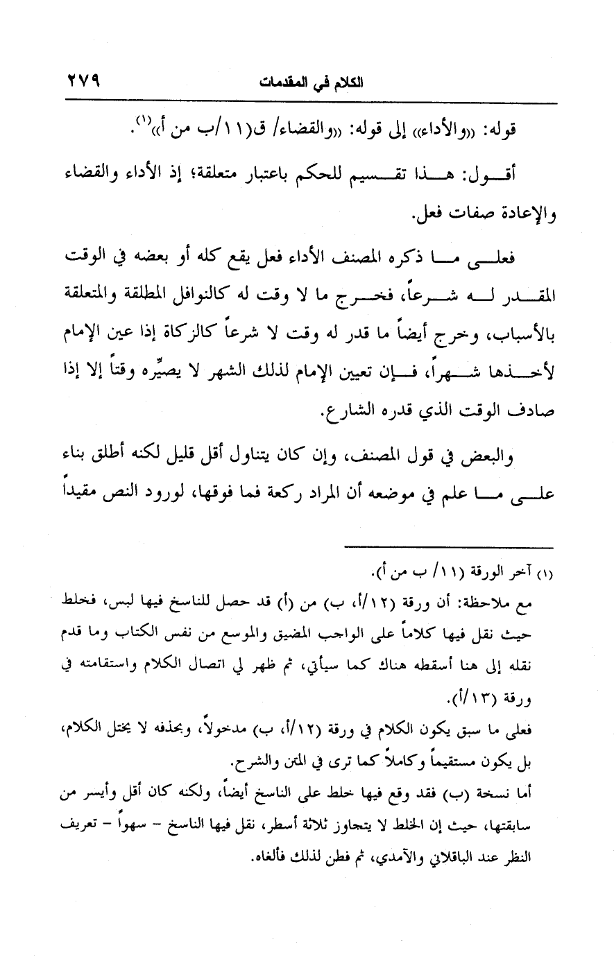 مع ملاحظة: أن ورقة (١٢/ أ، ب) من (أ) قد حصل للناسخ فيها لبس، فخلط حيث نقل فيها كلامًا على الواجب المضيق والموسع من نفس الكتاب وما قدم نقله إلى هنا أسقطه هناك كما سيأتي، ثم ظهر لي اتصال الكلام واستقامته في ورقة (١٣ / أ).