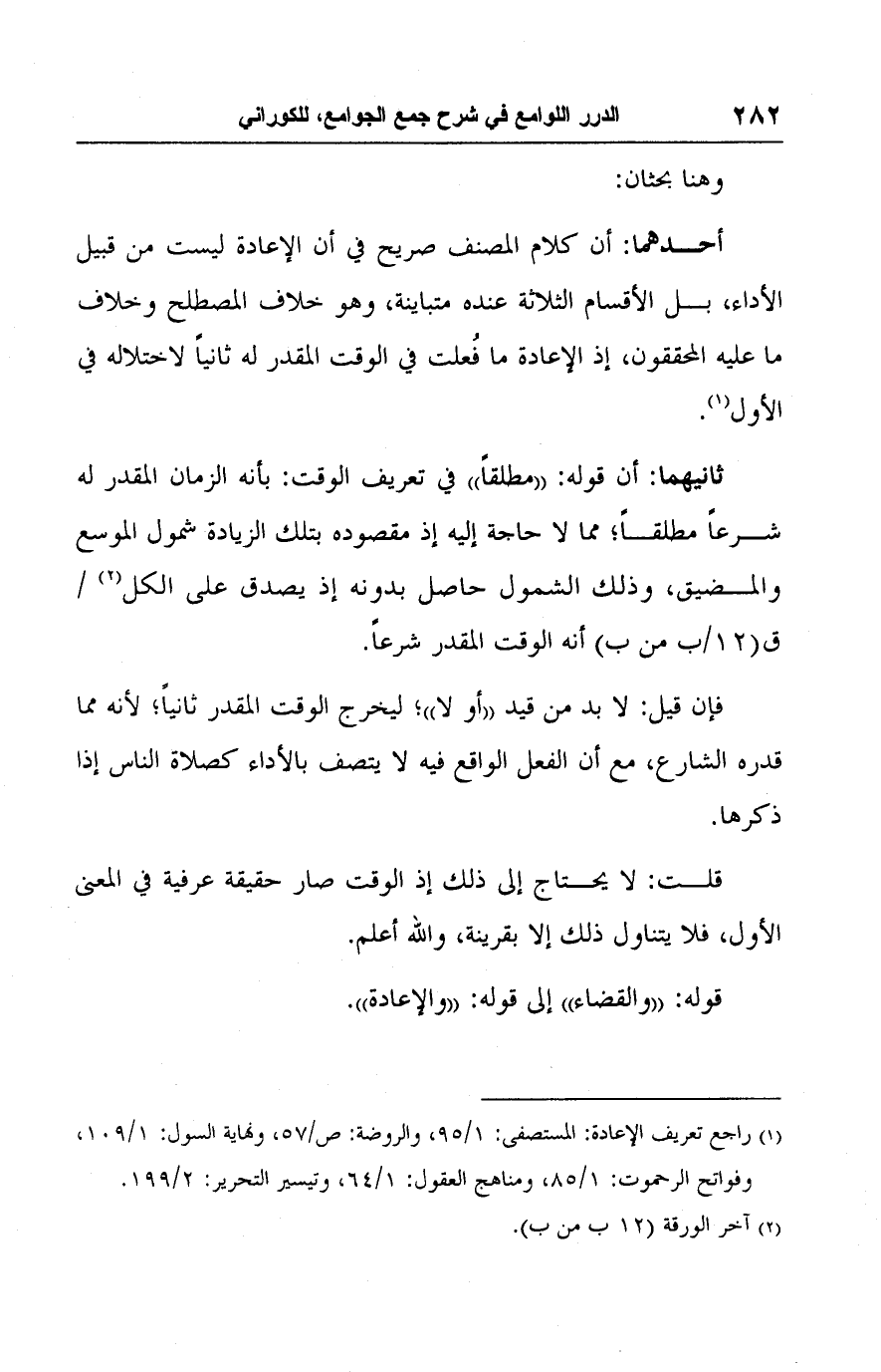 أحدهما: أن كلام المصنف صريح في أن الإعادة ليست من قبيل الأداء، بل الأقسام الثلاثة عنده متباينة، وهو خلاف المصطلح وخلاف ما عليه المحققون، إذ الاعادة ما فُعلت في الوقت المقدر له ثانيًا لاختلاله في الأول (١).