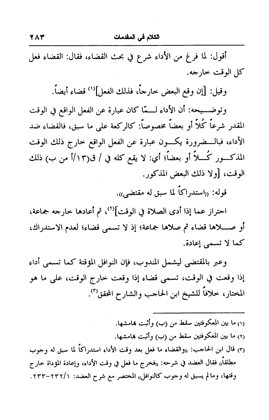 (٣) قال ابن الحاجب: "والقضاء ما فعل بعد وقت الأداء استدراكًا لما سبق له وجوب مطلقًا" فقال العضد في شرحه: "فخرج ما فعل في وقت الأداء، وإعادة المؤداة خارج وقتها، وما لم يسبق له وجوب كالنوافل" المختصر مع شرح العضد: ١/ ٢٣٢ - ٢٣٣.
