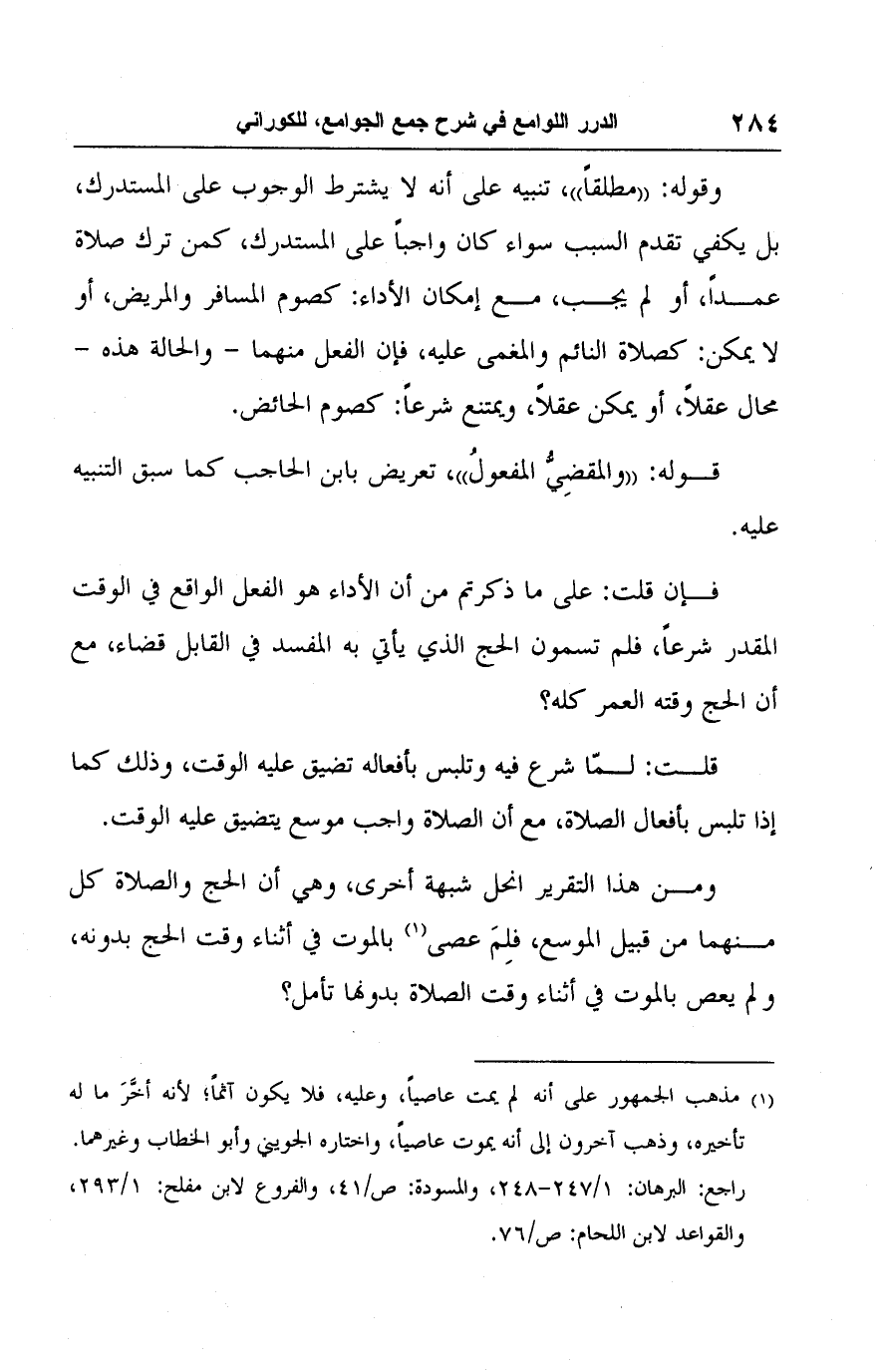 (١) مذهب الجمهور على أنه لم يمت عاصيًا، وعليه، فلا يكون آثمًا؛ لأنه أخَّرَ ما له تأخيره، وذهب آخرون إلى أنه يموت عاصيًا، واختاره الجويني وأبو الخطاب وغيرهما. راجع: البرهان: ١/ ٢٤٧ - ٢٤٨، والمسودة: ص / ٤١، والفروع لابن مفلح: ١/ ٢٩٣، والقواعد لابن اللحام: ص /٧٦.