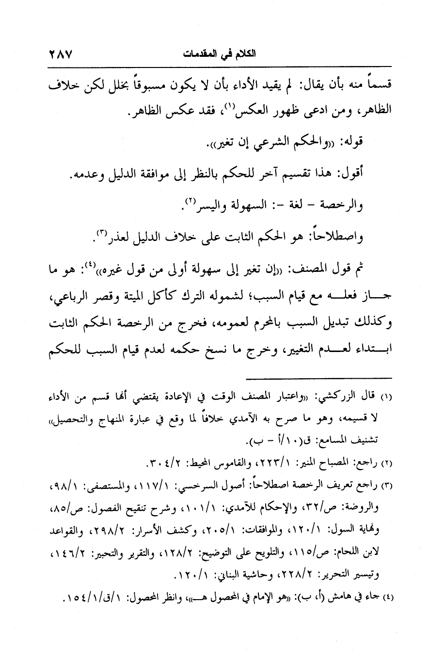 (٣) راجع تعريف الرخصة اصطلاحًا: أصول السرخسي: ١/ ١١٧، والمستصفى: ١/ ٩٨، والروضة: ص / ٣٢، والإحكام للآمدي: ١/ ١٠١، وشرح تنقيح الفصول: ص / ٨٥، ونهاية السول: ١/ ١٢٠، والموافقات: ١/ ٢٠٥، وكشف الأسرار: ٢/ ٢٩٨، والقواعد لابن اللحام: ص / ١١٥، والتلويح على التوضيح: ٢/ ١٢٨، والتقرير والتحبير: ٢/ ١٤٦، وتيسير التحرير: ٢/ ٢٢٨، وحاشية البناني: ١/ ١٢٠.