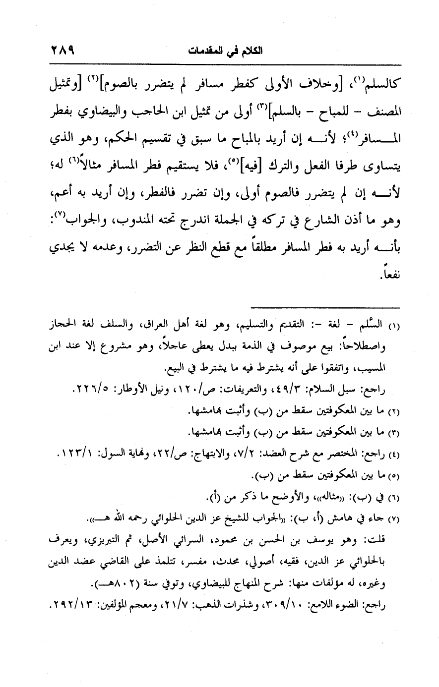 كالسلم (١)، [وخلاف الأولى كفطر مسافر لم يتضرر بالصوم] (٢) [وتمثيل المصنف -للمباح- بالسلم] (٣) أولى من تمثيل ابن الحاجب والبيضاوي بفطر المسافر (٤)؛ لأنه إن أريد بالمباح ما سبق في تقسيم الحكم، وهو الذي يتساوى طرفا الفعل والترك [فيه] (٥)، فلا يستقيم فطر المسافر مثالًا (٦) له؛ لأنه إن لم يتضرر فالصوم أولى، وإن تضرر فالفطر، وإن أريد به أعم، وهو ما أذن الشارع في تركه في الجملة اندرج تحته المندوب، والجواب (٧): بأنه أريد به فطر المسافر مطلقًا مع قطع النظر عن التضرر، وعدمه لا يجدي نفعًا.