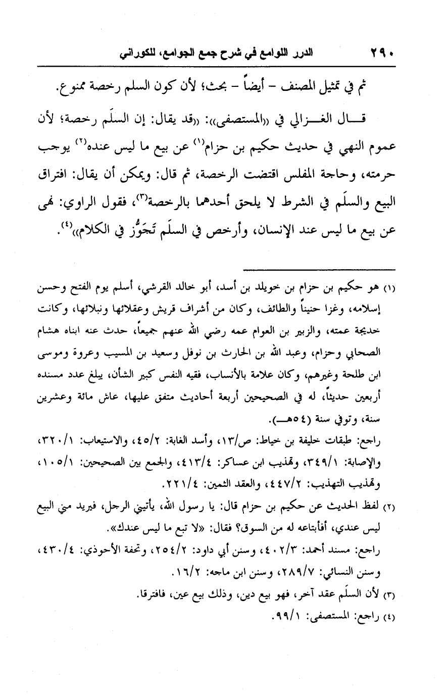 قال الغزالي في "المستصفى": "قد يقال: إن السلَم رخصة؛ لأن عموم النهى في حديث حكيم بن حزام (١) عن بيع ما ليس عنده (٢) يوجب حرمته، وحاجة المفلس اقتضت الرخصة، ثم قال: ويمكن أن يقال: افتراق البيع والسلَم في الشرط لا يلحق أحدهما بالرخصة (٣)، فقول الراوي: نهى عن بيع ما ليس عند الانسان، وأرخص في السلَم تَجَوُّز في الكلام" (٤).