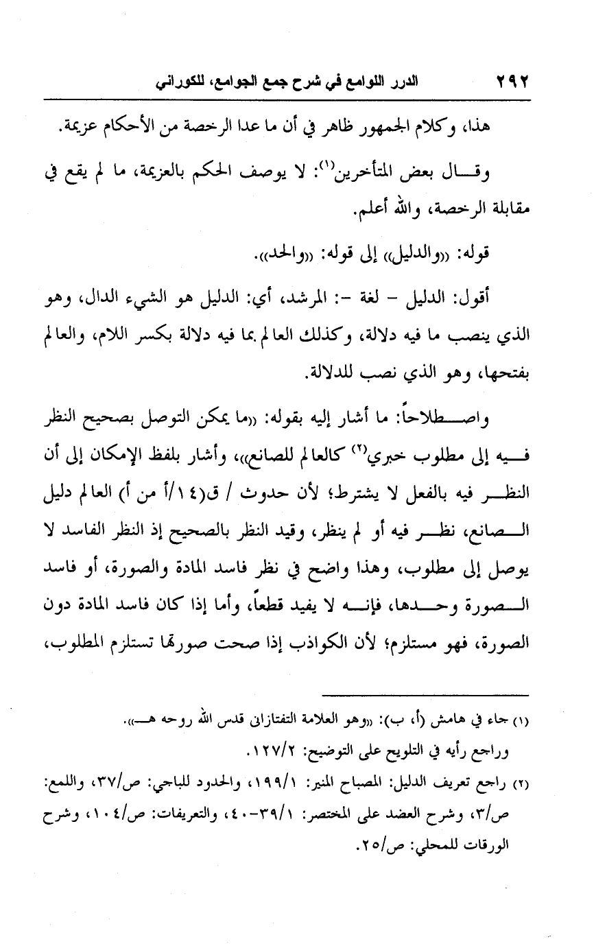(٢) راجع تعريف الدليل: المصباح المنير: ١/ ١٩٩، والحدود للباجي: ص / ٣٧، واللمع: ص / ٣، وشرح العضد على المختصر: ١/ ٣٩ - ٤٠، والتعريفات: ص / ١٠٤، وشرح الورقات للمحلي: ص/٢٥.