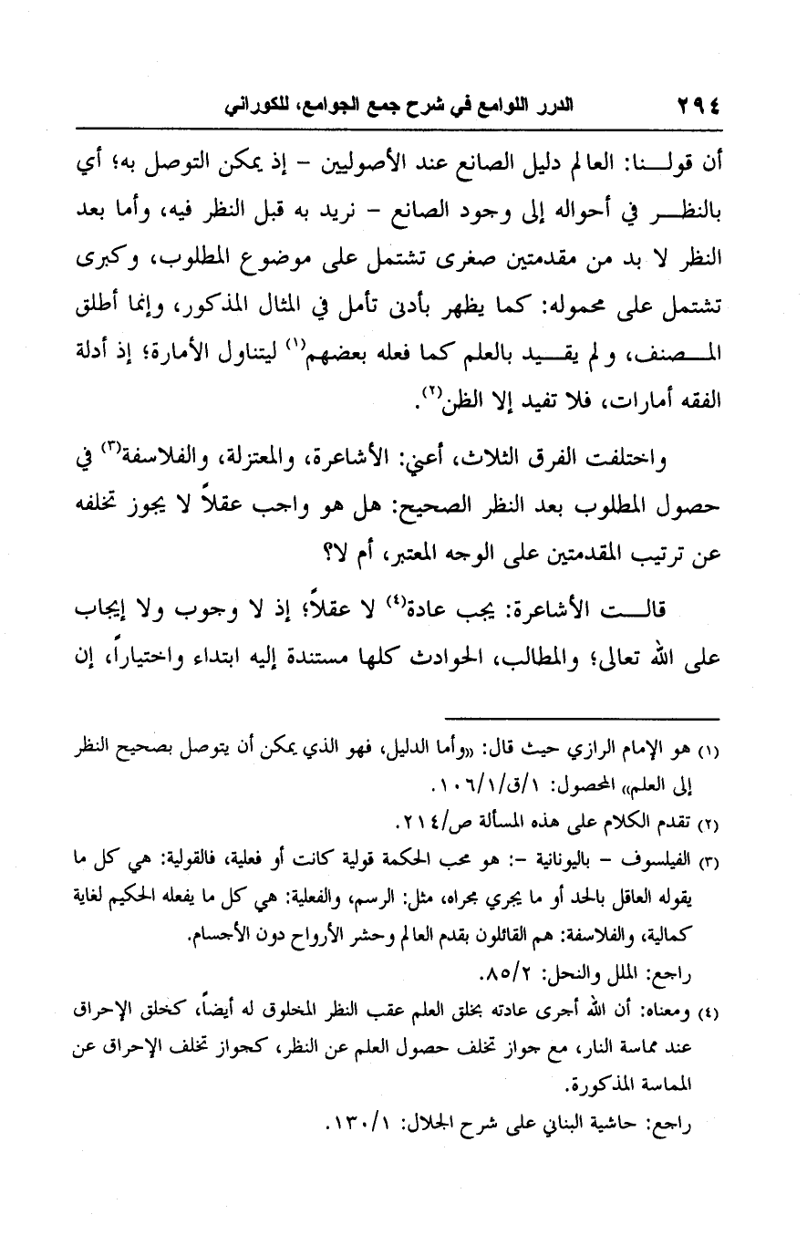 (٤) ومعناه: أن الله أجرى عادته بخلق العلم عقب النظر المخلوق له أيضًا، كخلق الإحراق عند مماسة النار، مع جواز تخلف حصول العلم عن النظر، كجواز تخلف الإحراق عن المماسة المذكورة.