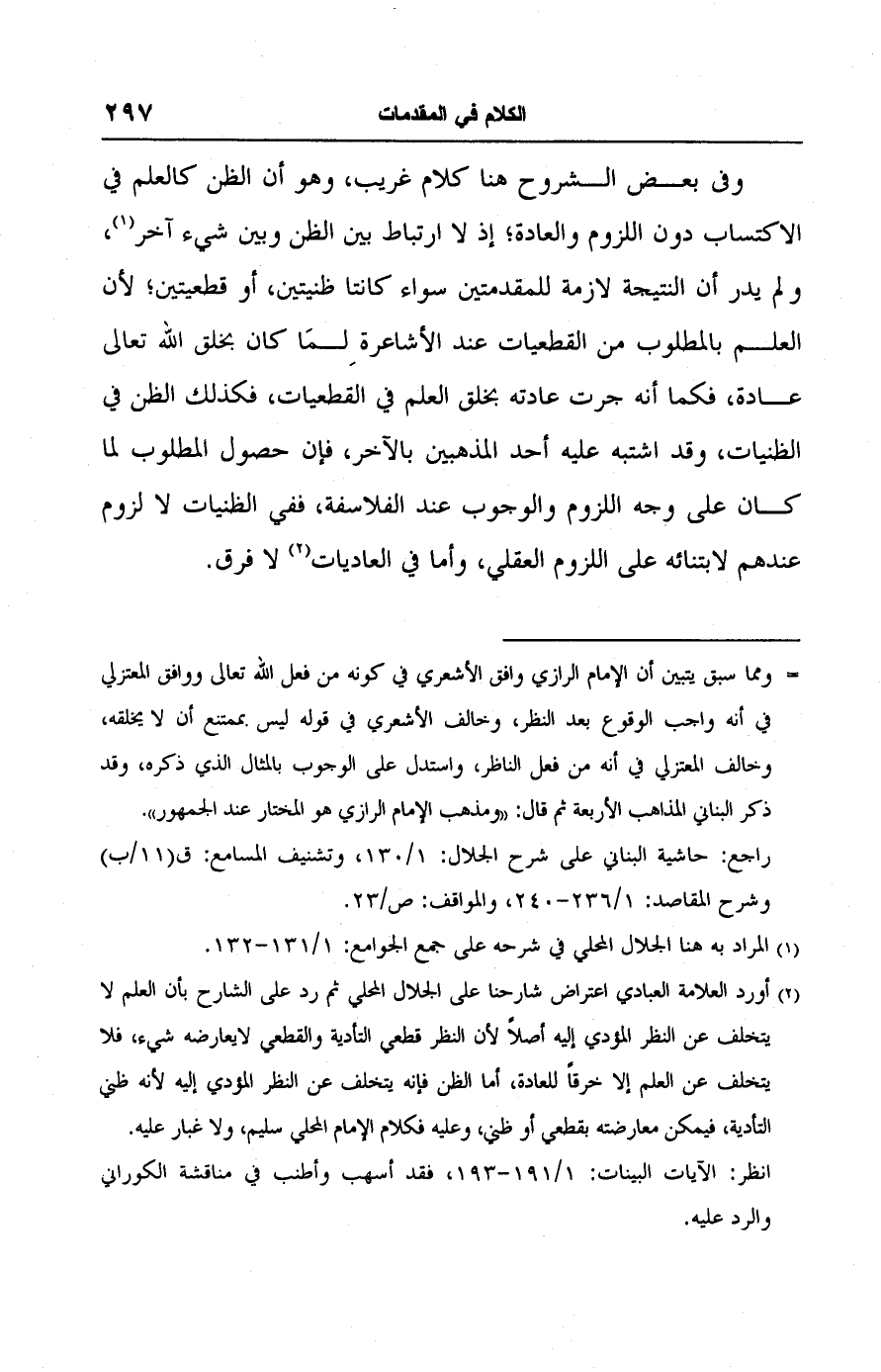 راجع: حاشية البناني على شرح الجلال: ١/ ١٣٠، وتشنيف المسامع: ق (١١/ ب) وشرح المقاصد: ١/ ٢٣٦ - ٢٤٠، والمواقف: ص / ٢٣.