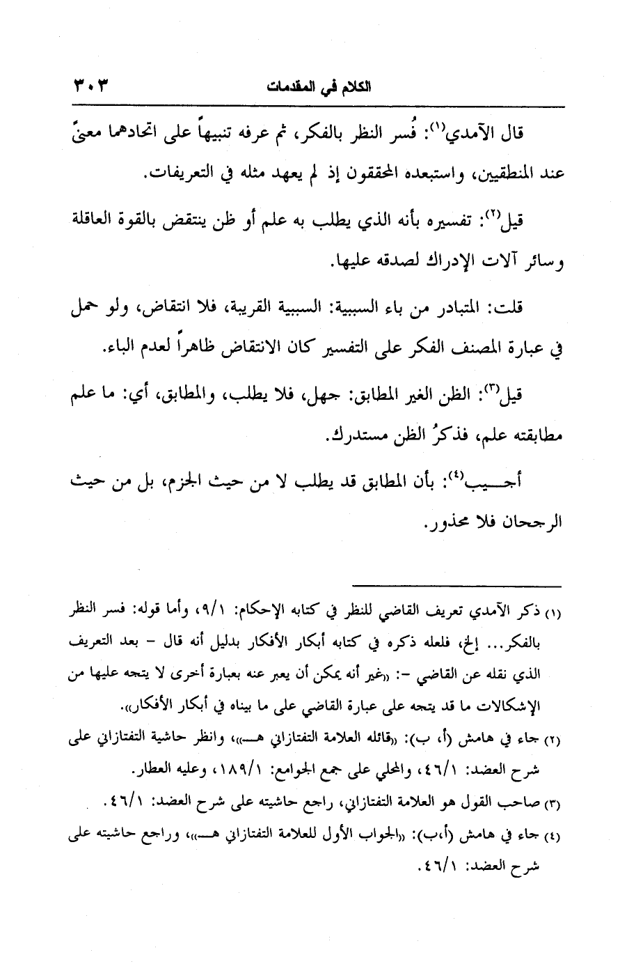 (١) ذكر الآمدي تعريف القاضي للنظر في كتابه الإحكام: ١/ ٩، وأما قوله: فسر النظر بالفكر ... إلخ، فلعله ذكره في كتابه أبكار الأفكار بدليل أنه قال -بعد التعريف الذي نقله عن القاضي-: "غير أنه يمكن أن يعبر عنه بعبارة أخرى لا يتجه عليها من الإشكالات ما قد يتجه على عبارة القاضي على ما بيناه في أبكار الأفكار".