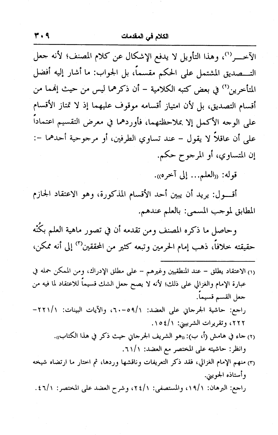 (١) الاعتقاد يطلق -عند المنطقيين وغيرهم- على مطلق الإدراك، ومن الممكن حمله في عبارة الإمام والغزالي على ذلك؛ لأنه لا يصح جعل الشك قسيمًا للاعتقاد لما فيه من جعل القسم قسيمًا.