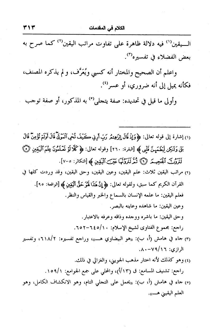 (٢) مراتب اليقين ثلاث: علم اليقين، وعين اليقين، وحق اليقين، وقد وردت كلها في القرآن الكريم كما سبق، ولقوله تعالى: {إِنَّ هَذَا لَهُوَ حَقُّ الْيَقِينِ} [الواقعة: ٩٥].