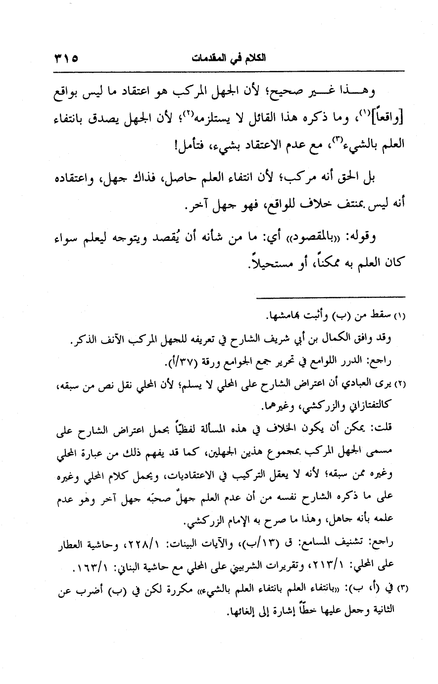وهذا غير صحيح؛ لأن الجهل المركب هو اعتقاد ما ليس بواقع [واقعًا] (١)، وما ذكره هذا القائل لا يستلزمه (٢)؛ لأن الجهل يصدق بانتفاء العلم بالشئ (٣)، مع عدم الاعتقاد بشئ، فتأمل!