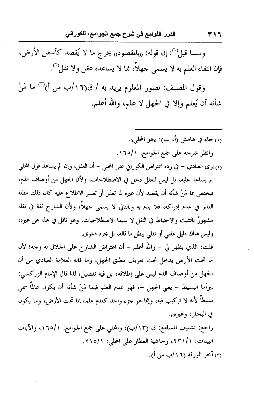 (٢) يرى العبادي -في رده اعتراض الكوراني على المحلي- أن العقل، وإن لم يساعد قول المحلي لم يساعد عليه، بل ليس للعقل دخل في الاصطلاحات، ولأن الجهل من أوصاف الذم، فيختص بما مَنْ شأنه أن يقصد لأن غيره لما تعذر أو تعسر الاطلاع عليه كان ذلك مظنة العذر في عدم إدراكه، فلا يذم به وبالتالي لا يسمى جهلًا، ولأن الشارح ثقة في نقله مشهورٌ بالتثبت والاحتياط في النقل لا سيما الاصطلاحيات، وهو ناقل في هذا عن غيره، وليس هناك دليل عقلي أو نقلي يبطل ما قاله، بل مجرد دعوى.