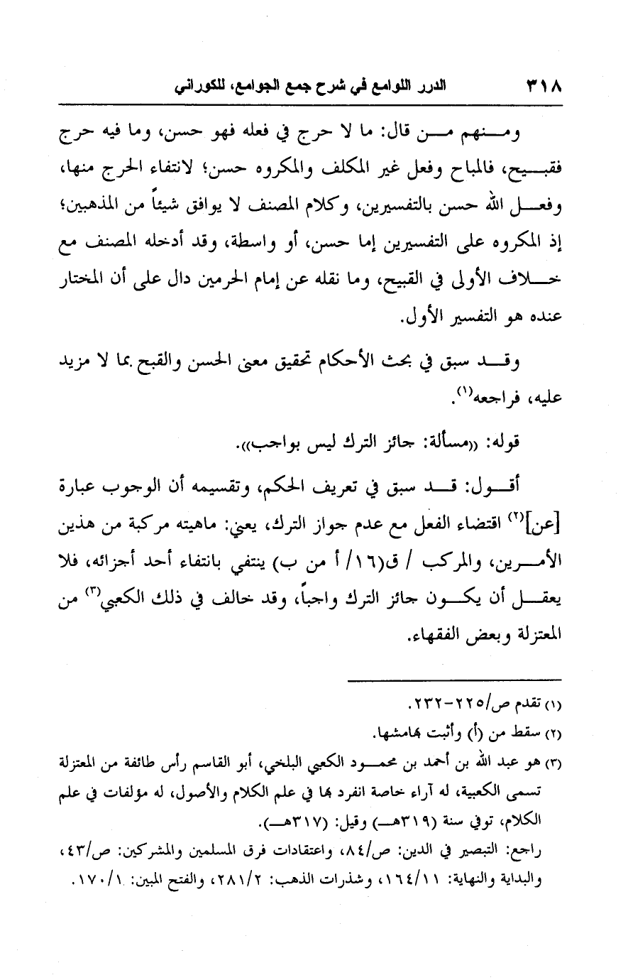 (٣) هو عبد الله بن أحمد بن محمود الكعبي البلخي، أبو القاسم رأس طائفة من المعتزلة تسمى الكعبية، له آراء خاصة انفرد بها في علم الكلام والأصول، له مؤلفات في علم الكلام، توفي سنة (٣١٩ هـ) وقيل: (٣١٧ هـ).