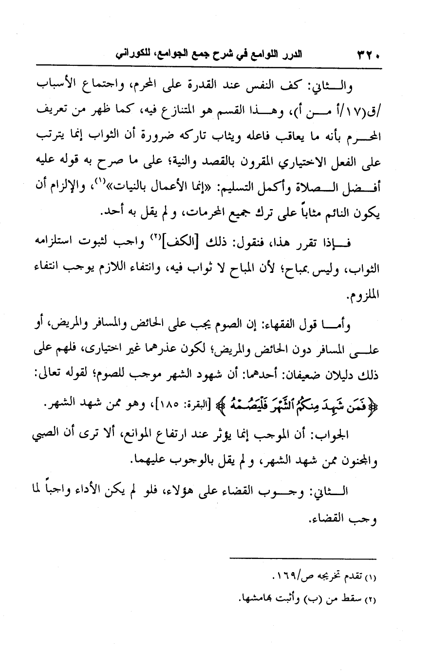 والثاني: كف النفس عند القدرة على المحرم، واجتماع الأسباب، وهذا القسم هو المتنازع فيه، كما ظهر من تعريف المحرم بأنه ما يعاقب فاعله ويثاب تاركه ضرورة أن الثواب إنما يترتب على الفعل الاختياري المقرون بالقصد والنية؛ على ما صرح به قوله عليه أفضل الصلاة وأكمل التسليم: "إنما الأعمال بالنيات" (١)، والإلزام أن يكون النائم مثابًا على ترك جميع المحرمات، ولم يقل به أحد.