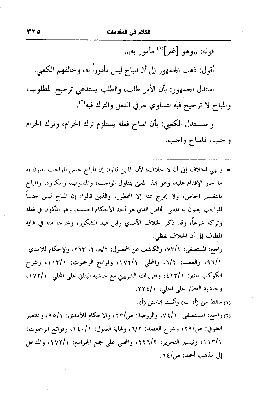 = ينتهي الخلاف إلى أن لا خلاف؛ لأن الذين قالوا: إن المباح جنس للواجب يعنون به ما جاز الإقدام عليه، وهو بهذا المعنى يتناول الواجب، والمندوب، والمكروه، والمباح بالتفسير الخاص، ولا يخرج عنه إلا المحظور، والذين قالوا: إن المباح ليس جنسًا للواجب يعنون به المعنى الخاص الذي هو أحد الأحكام الخمسة، وهو المأذون في فعله وتركه شرعًا، وقد ذكر الخلاف الآمدي وابن عبد الشكور، وخرجا منه في نهاية المطاف إلى أن الخلاف لفظي.