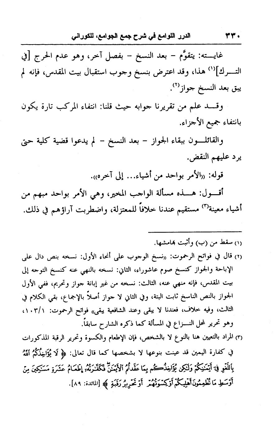 (٢) قال في فواتح الرحموت: "نسخ الوجوب على أنحاء الأول: نسخه بنص دال على الإباحة والجواز كنسخ صوم عاشوراء، الثاني: نسخه بالنهي عنه كنسخ التوجه إلى بيت المقدس، فإنه منهى عنه، الثالث: نسخه من غير إبانة جواز وتحريم، ففى الأول الجواز بالنص الناسخ ثابت البتة، وفي الثاني لا جواز أصلًا بالإجماع، بقى الكلام في الثالث، وفيه خلاف، فعندنا لا يبقى وعند الشافعية يبقى" فواتح الرحموت: ١/ ١٠٣، وهو تحرير لمحل النزاع في المسألة كما ذكره الشارح سابقًا.