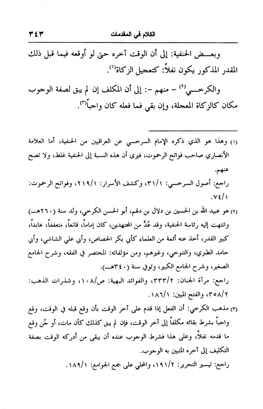 (٢) هو عبيد الله بن الحسين بن دلال بن دلهم، أبو الحسن الكرخي، ولد سنة (٢٦٠ هـ) وانتهت إليه رئاسة الحنفية، وقد عُدَّ من المجتهدين، كان إمامًا، قانعًا، متعففًا، عابدًا، كبير القدر، أخذ عنه أئمة من العلماء كأبي بكر الجصاص، وأبى على الشاشى، وأبى حامد الطبرى، والتنوخى، وغيرهم، ومن مؤلفاته: المختصر في الفقه، وشرح الجامع الصغير، وشرح الجامع الكبير، وتوفي سنة (٣٤٠ هـ).