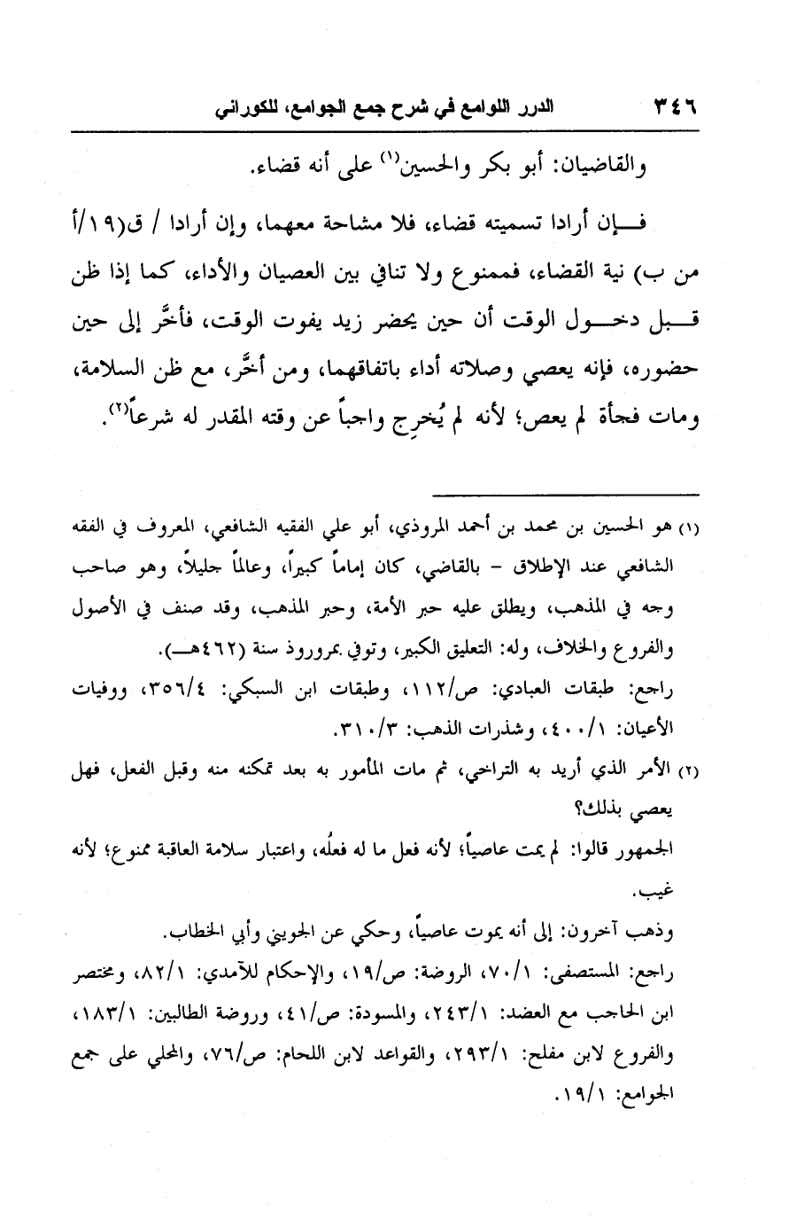 فإن أرادا تسميته قضاء، فلا مشاحة معهما، وإن أرادا نية القضاء، فممنوع ولا تنافي بين العصيان والأداء، كما إذا ظن قبل دخول الوقت أن حين يحضر زيد يفوت الوقت، فأخَّر إلى حين حضوره، فإنه يعصي وصلاته أداء باتفاقهما، ومن أخَّر، مع ظن السلامة، ومات فجأة لم يعص؛ لأنه لم يُخرِج واجبًا عن وقته المقدر له شرعًا (٢).