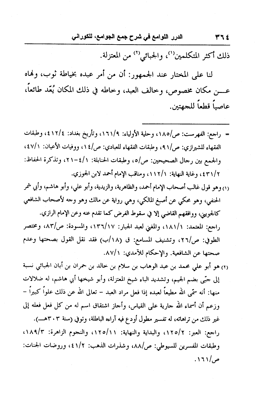 (٢) هو أبو علي محمد بن عبد الوهاب بن سلام بن خالد بن حمران بن أبان الجبائي نسبة إلى جبّى بضم الجيم، وتشديد الباء شيخ المعتزلة، وأبو شيخها أبي هاشم، له ضلالات منها: أنه سمّى الله مطيعًا لعبده إذا فعل مراد العبد -تعالى الله عن ذلك علوًا كبيرًا- وزعم أن أسماء الله جارية على القياس، وأجاز اشتقاق اسم له من كل فعل فعله إلى غير ذلك من تراهاته، له تفسير مطول أودع فيه آراءه الباطلة، وتوفي (سنة ٣٠٣ هـ).