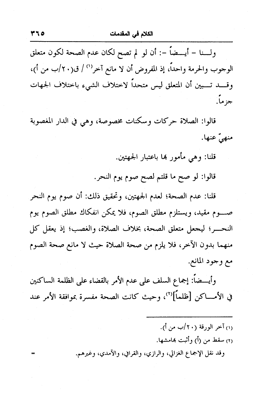 وأيضًا: إجماع السلف على عدم الأمر بالقضاء على الظلمة الساكنين في الأماكن [ظلمًا] (٢)، وحيث كانت الصحة مفسرة بموافقة الأمر عند