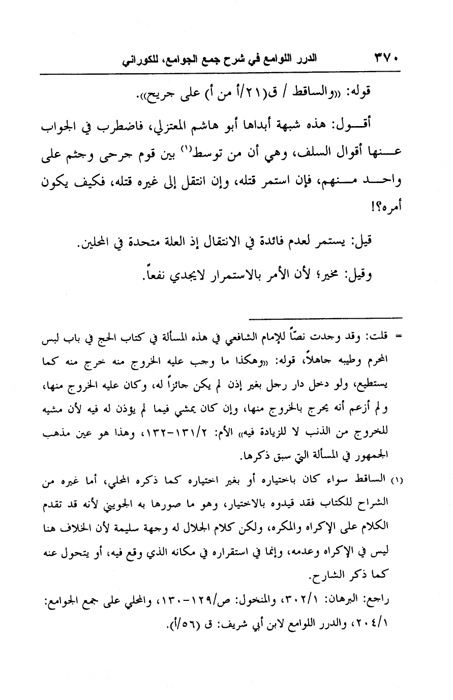 = قلت: وقد وجدت نصًّا للإمام الشافعي في هذه المسألة في كتاب الحج في باب لبس المحرم وطيبه جاهلًا، قوله: "وهكذا ما وجب عليه الخروج منه خرج منه كما يستطيع، ولو دخل دار رحل بغير إذن لم يكن جائزًا له، وكان عليه الخروج منها، ولم أزعم أنه يحرج بالخروج منها، وإن كان يمشي فيما لم يؤذن له فيه لأن مشيه للخروج من الذنب لا للزيادة فيه" الأم: ٢/ ١٣١ - ١٣٢، وهذا هو عين مذهب الجمهور في المسألة التي سبق ذكرها.