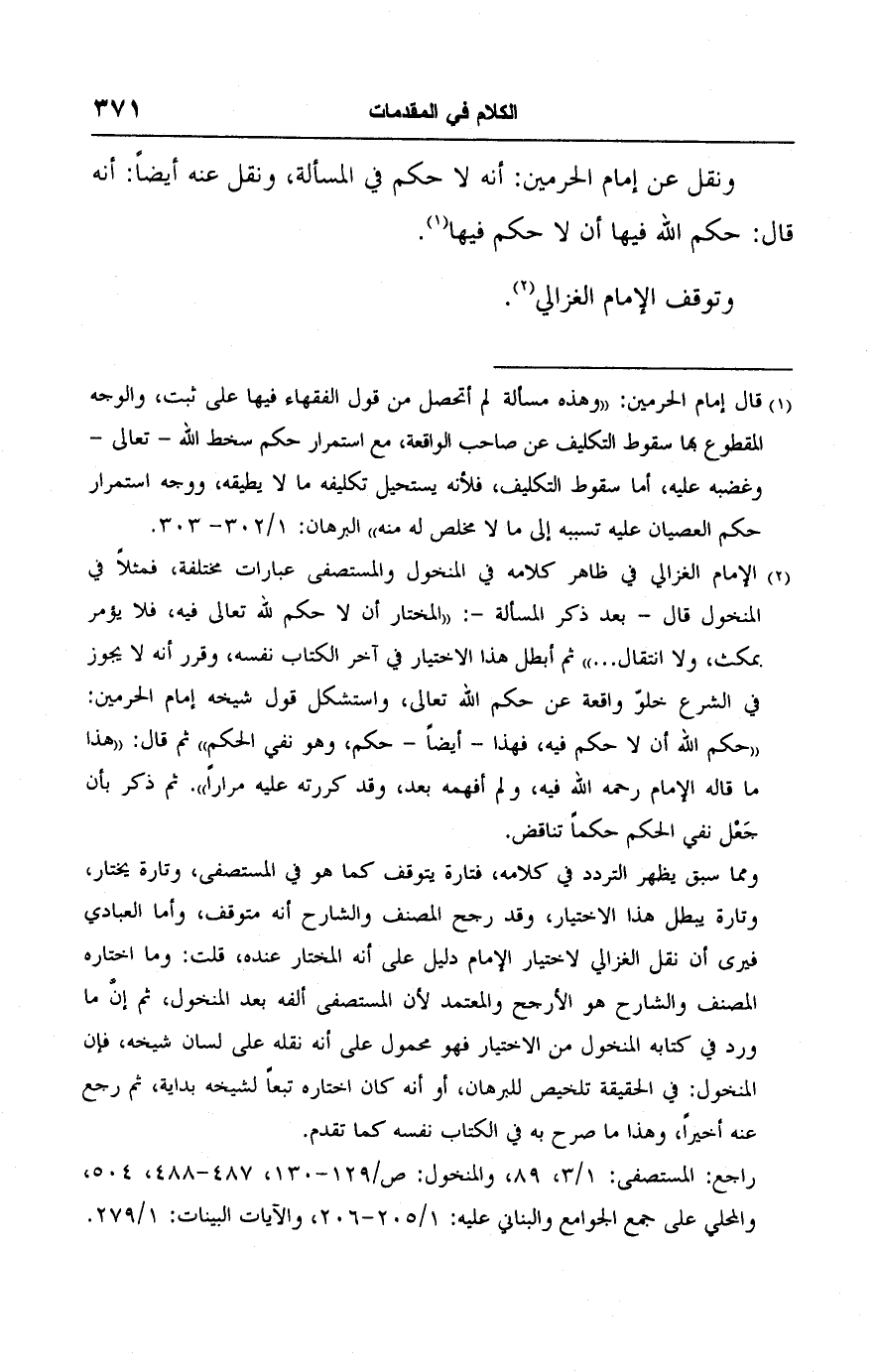 (٢) الإمام الغزالي في ظاهر كلامه في المنخول والمستصفى عبارات مختلفة، فمثلا في المنخول قال -بعد ذكر المسألة-: "المختار أن لا حكم لله تعالى فيه، فلا يؤمر بمكث، ولا انتقال ... " ثم أبطل هذا الاختيار في آخر الكتاب نفسه، وقرر أنه لا يجوز في الشرع خلوّ واقعة عن حكم الله تعالى، واستشكل قول شيخه إمام الحرمين: "حكم الله أن لا حكم فيه، فهذا -أيضًا- حكم، وهو نفي الحكم" ثم قال: "هذا ما قاله الإمام رحمه الله فيه، ولم أفهمه بعد، وقد كررته عليه مرارًا". ثم ذكر بأن جَعْل نفي الحكم حكمًا تناقض.