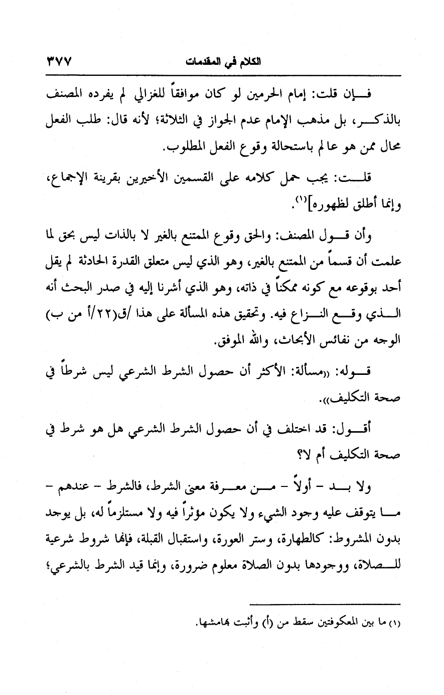 ولا بد -أولًا- من معرفة معنى الشرط، فالشرط -عندهم- ما يتوقف عليه وجود الشيء ولا يكون موثرًا فيه ولا مستلزمًا له، بل يوجد بدون المشروط: كالطهارة، وستر العورة، واستقبال القبلة، فإنها شروط شرعية للصلاة، ووجودها بدون الصلاة معلوم ضرورة، وإنما قيد الشرط بالشرعي؛
